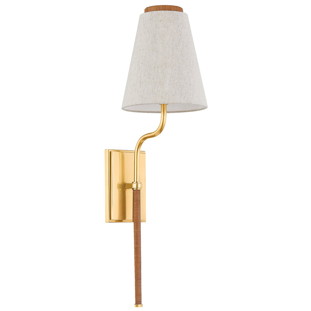Tailored, yet relaxed, the Cortney Bishop x Hudson Valley Lighting Sullivan sconce blends texture-rich natural linen and rattan. The unique curvature of the stem provides a graphic detail, elevating the simple design with graceful lines. An Aged Brass finish on the metalwork balances the tactile materials. Alone or in multiples, Sullivan is a pleasing addition to hallways, bedrooms, bookcases, and powder rooms.