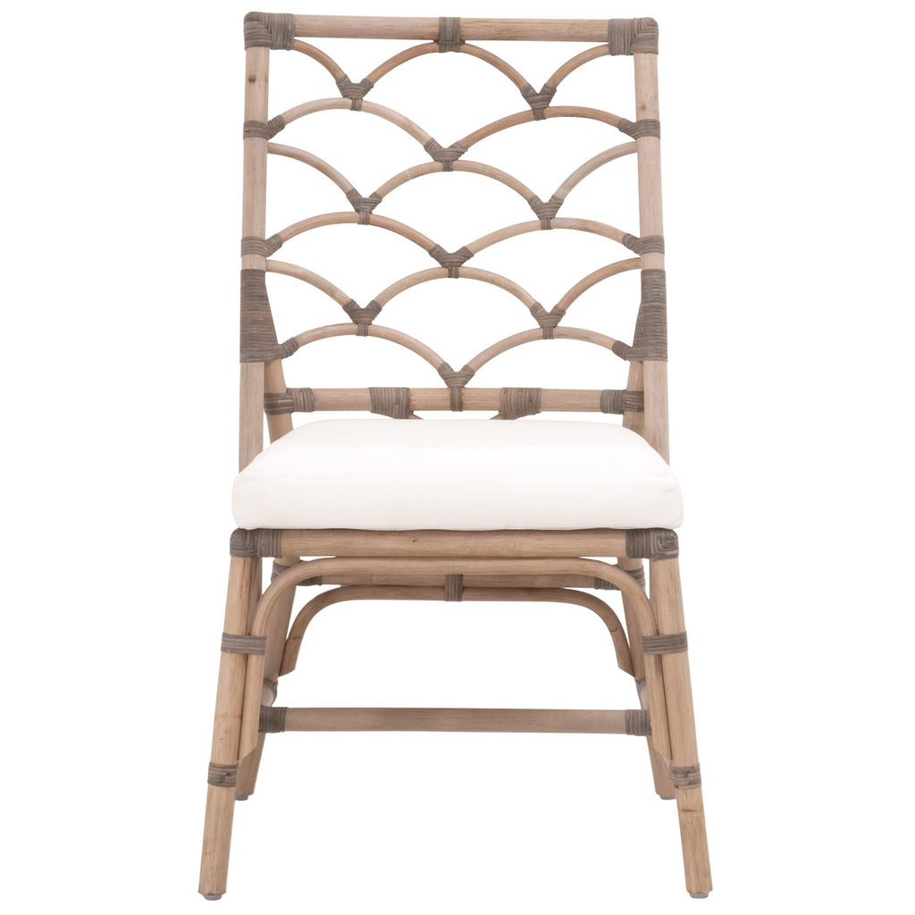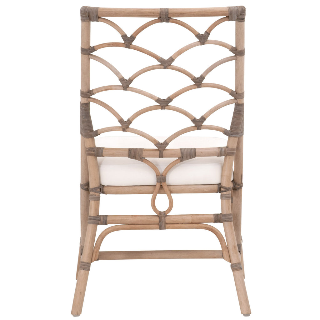 Designed with a tropical look, this unique Crescent Dining Chair by Essentials For Living will be ideal in a coastal, transitional, or bohemian dining room or kitchen. It is constructed with matte gray natural rattan materials that are hand-shaped into a beautiful design. The seat back has a crescent-shaped lattice design framed by a squared frame. Matte gray rattan binding adds a nice contrast to the rattan pole. The white upholstered seat complements the warm brown and gray hues of the frame. It measures 22.5" wide, 23.75" deep, 36.5" high, with a seat height of 20". The neutral tones of this chair will fit well with many dining room tables to create the perfect tropical-inspired aesthetic.
