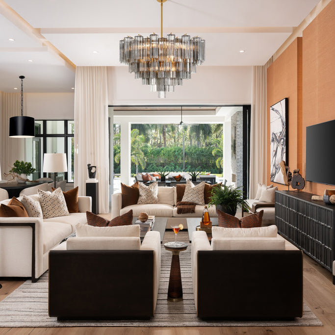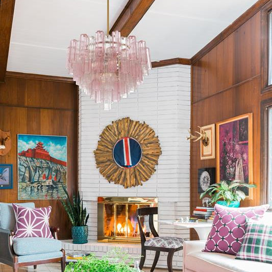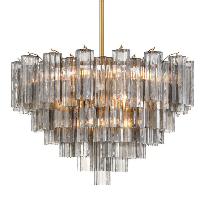 The captivating Addis Lighting Collection is a modern-day interpretation ofthe iconic mid-century Tronchi chandelier. Inspired by its predecessor's sleek lines and geometric shapes, the Addis features a polished Chrome or Aged Brass metal frame that exudes sophistication and style. Its unique design showcases transparent tiers of textured Tronchi glass tubes, forming a mesmerizing 5-point rounded star shape. Choose from a range of glass colors, including clear, amber, smoke, and white, or the stunning Autumn option, which features a captivating multicolor disposition of amber, clear, and smoke Tronchi glass. The Addis Lighting Collection offers various sizes and finishes, allowing you to find the perfect fit for your space while adding a touch of timeless elegance.