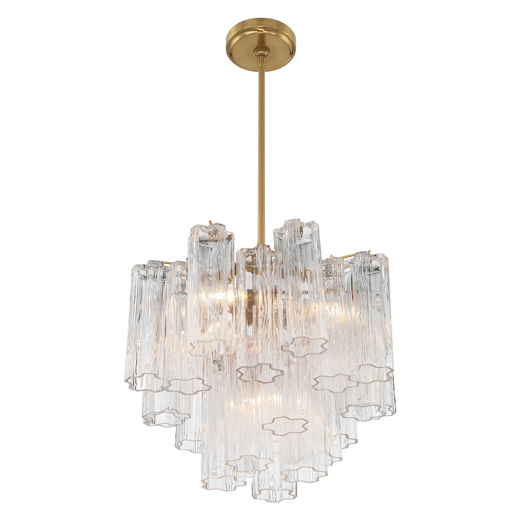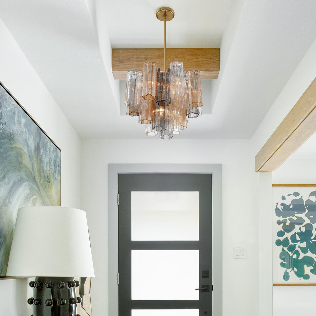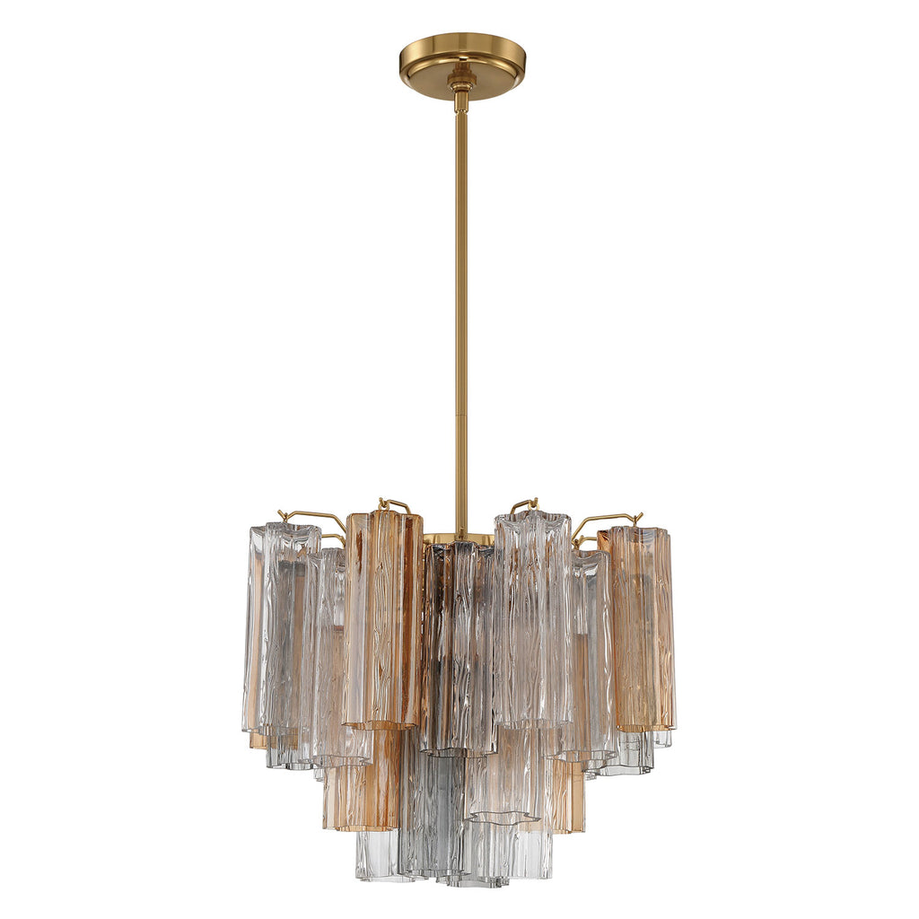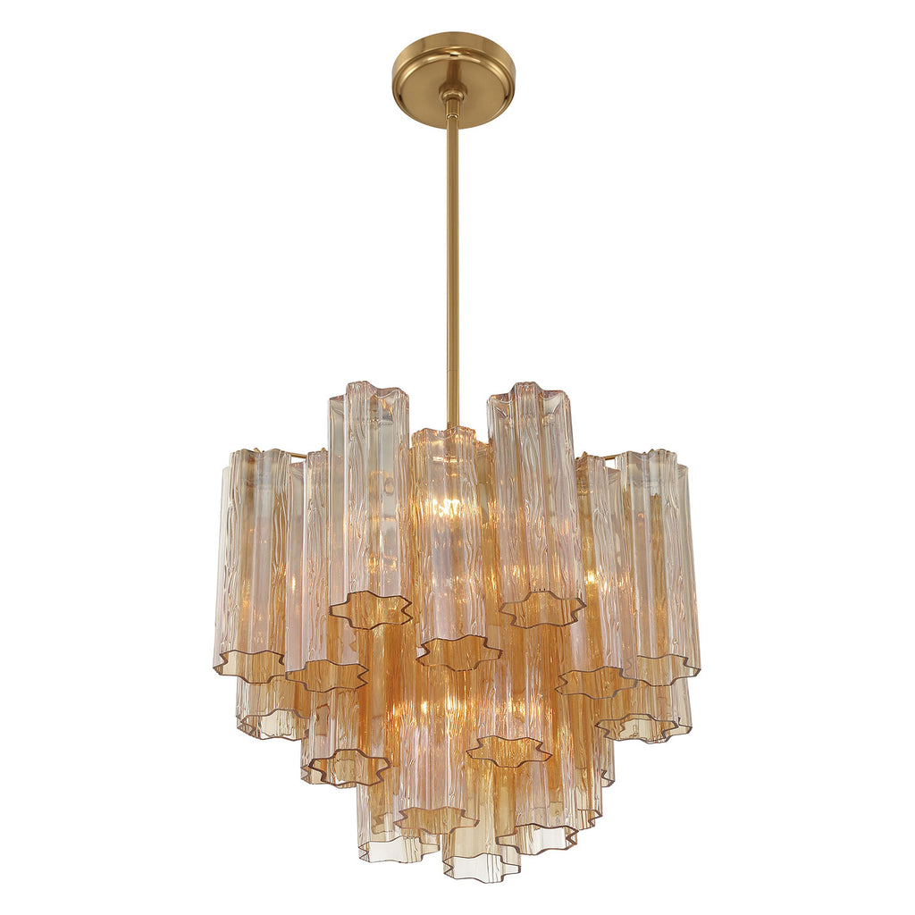 Crystorama is known for its standout lighting, which is exceptional in quality and design. From traditional all-crystal designs to transitional lighting collections, Crystorama offers styles that will match any décor and are always in fashion. The captivating Addis Lighting Collection is a modern-day interpretation of the iconic mid-century Tronchi chandelier. Inspired by its predecessor's sleek lines and geometric shapes, the Addis features a polished Chrome or Aged Brass metal frame that exudes sophistication and style. Its unique design showcases transparent tiers of textured Tronchi glass tubes, forming a mesmerizing 5-point rounded star shape. Choose from a range of glass colors, including clear, amber, smoke, and white, or the stunning Autumn option, which features a captivating multicolor disposition of amber, clear, and smoke Tronchi glass. The Addis Lighting Collection offers various sizes and finishes, allowing you to find the perfect fit for your space while adding a touch of timeless elegance. Addis collection features a versatile transitional design. A merging of design utilizing minimalist styling and clean lines that add visual appeal to a space. This multi tiered modern fixture gives maximum light output either as a chandelier or a ceiling mount. Aged Brass metal finish is treated to look aged and have a rich hue. This shade adds a luxurious touch to any room and is perfect for modern and contemporary settings.