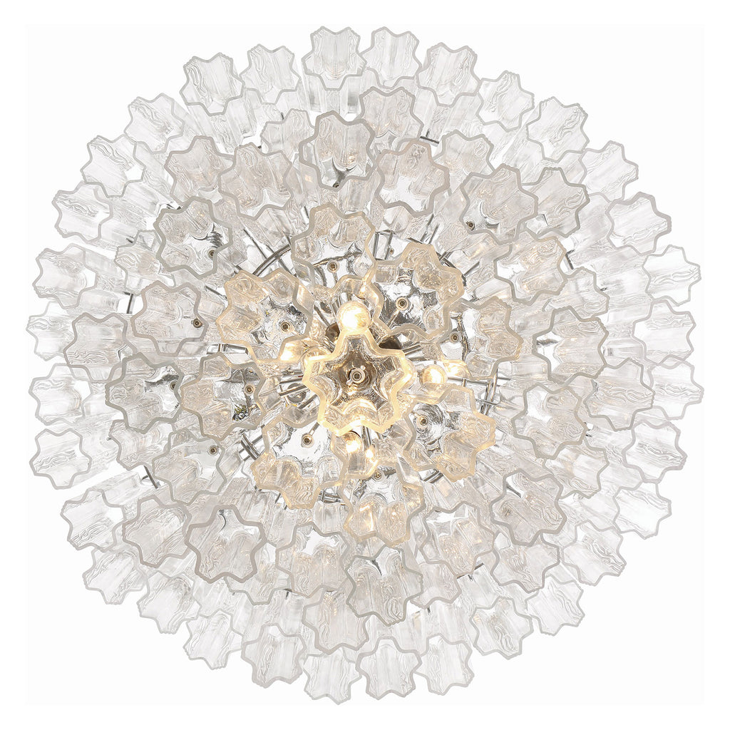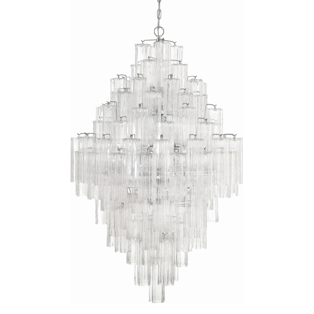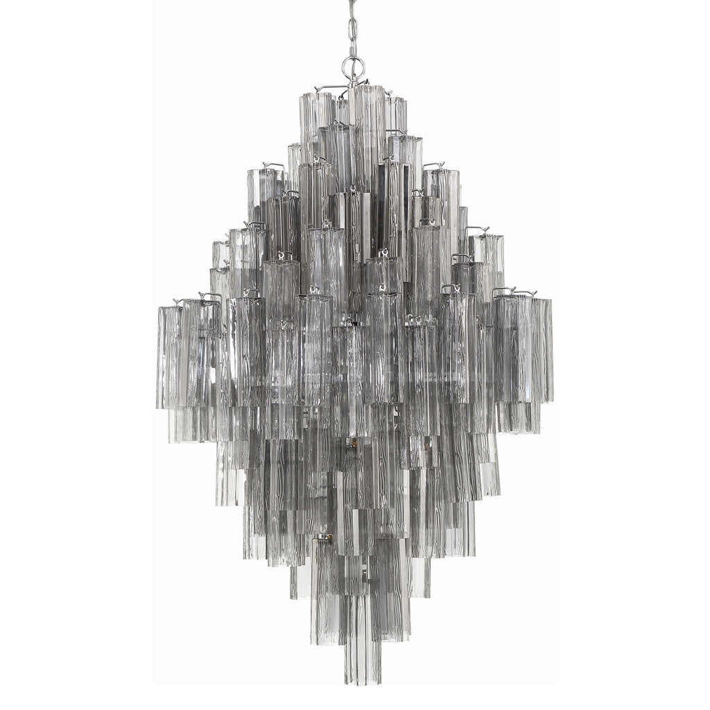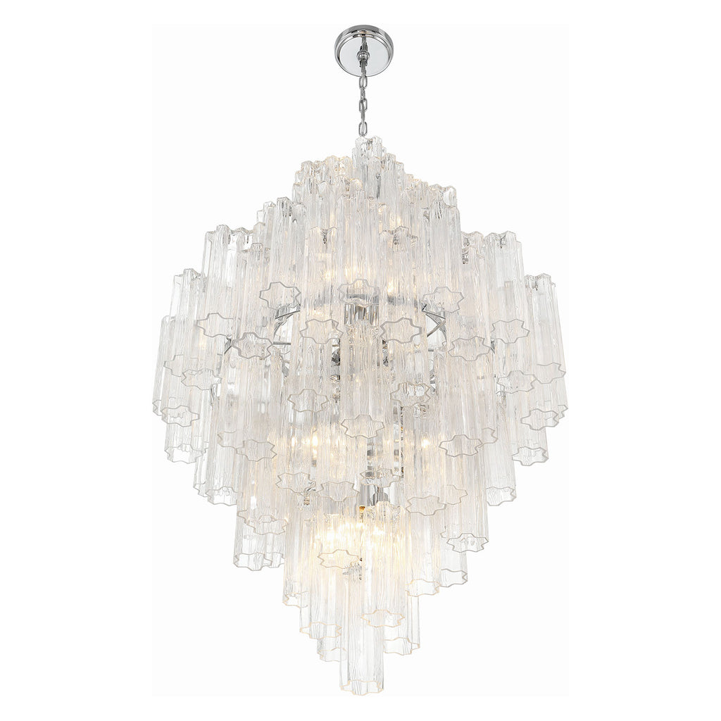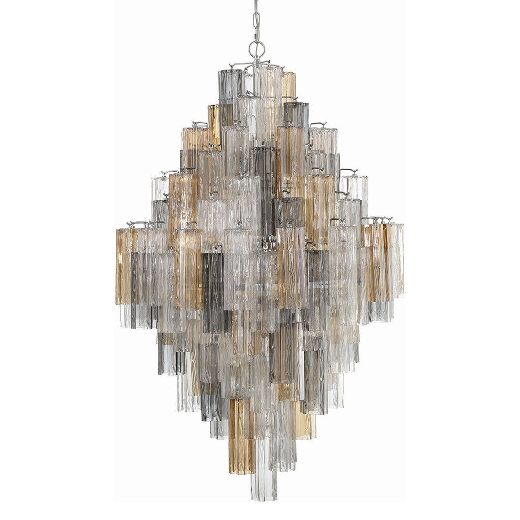 Crystorama is known for its standout lighting, which is exceptional in quality and design. From traditional all-crystal designs to transitional lighting collections, Crystorama offers styles that will match any décor and are always in fashion. A stylish beauty. The captivating Addis Lighting Collection is a modern-day interpretation of the iconic mid-century Tronchi chandelier. Inspired by its predecessor's sleek lines and geometric shapes, the Addis features a polished Chrome or Aged Brass metal frame that exudes sophistication and style. Its unique design showcases transparent tiers of textured Tronchi glass tubes, forming a mesmerizing 5-point rounded star shape. Choose from a range of glass colors, including clear, amber, smoke, and white, or the stunning Autumn option, which features a captivating multicolor disposition of amber, clear, and smoke Tronchi glass. The Addis Lighting Collection offers various sizes and finishes, allowing you to find the perfect fit for your space while adding a touch of timeless elegance. Authorized for use in dry interior locations.