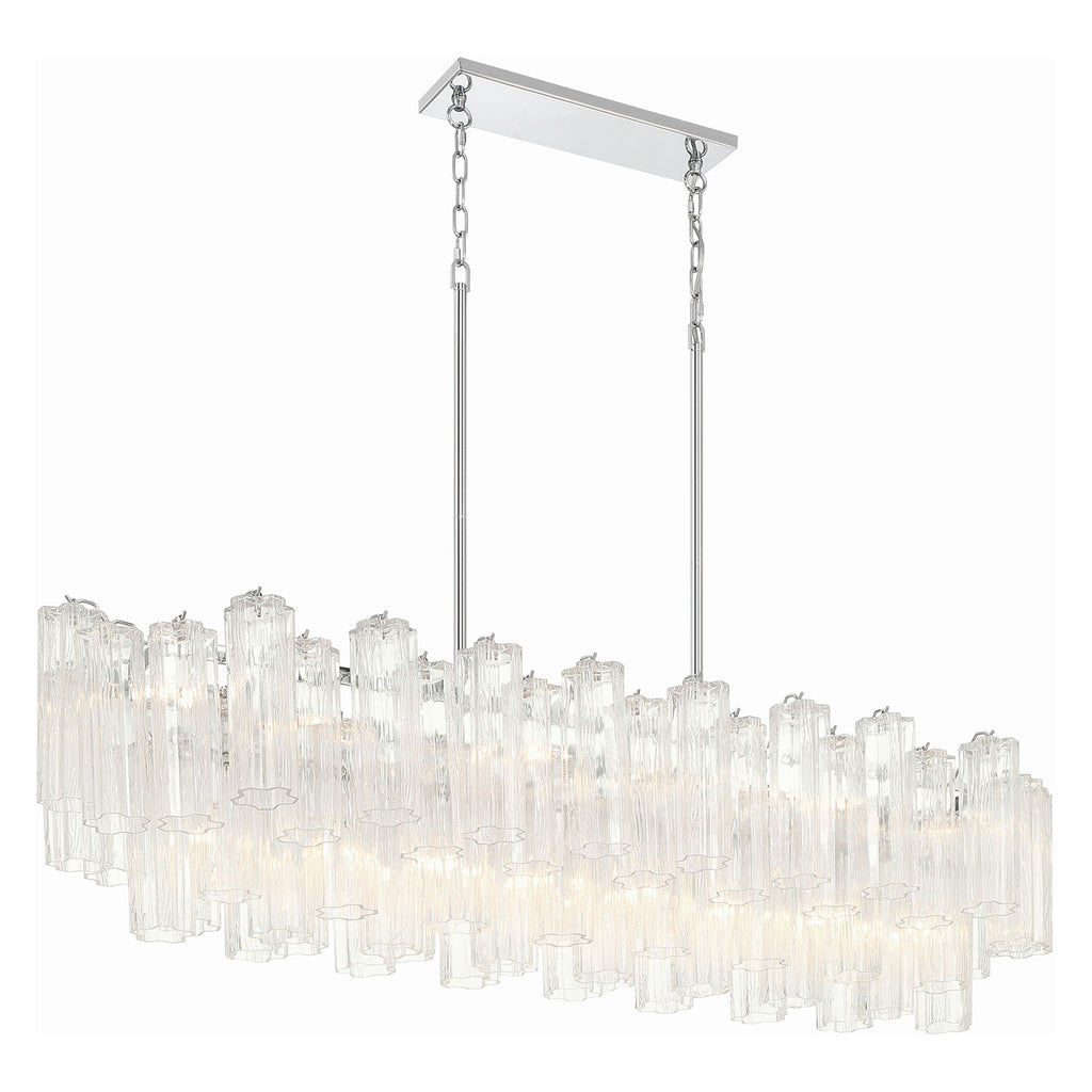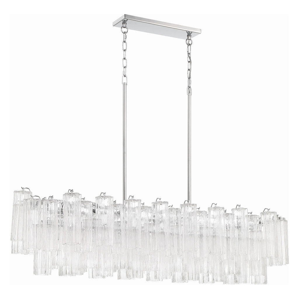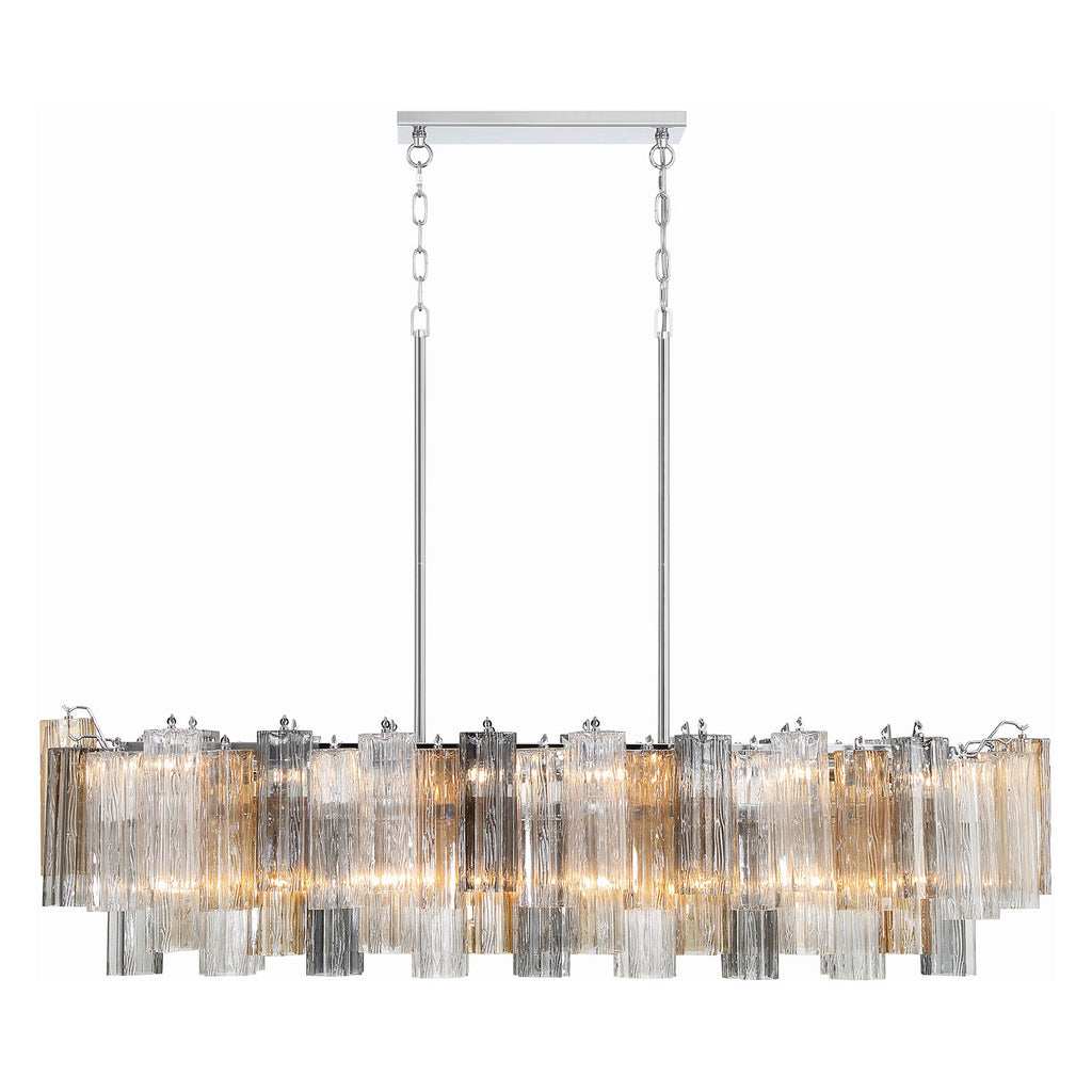 Crystorama is known for its standout lighting, which is exceptional in quality and design. From traditional all-crystal designs to transitional lighting collections, Crystorama offers styles that will match any décor and are always in fashion. A stylish beauty. The captivating Addis Lighting Collection is a modern-day interpretation of the iconic mid-century Tronchi chandelier. Inspired by its predecessor's sleek lines and geometric shapes, the Addis features a polished Chrome or Aged Brass metal frame that exudes sophistication and style. Its unique design showcases transparent tiers of textured Tronchi glass tubes, forming a mesmerizing 5-point rounded star shape. Choose from a range of glass colors, including clear, amber, smoke, and white, or the stunning Autumn option, which features a captivating multicolor disposition of amber, clear, and smoke Tronchi glass. The Addis Lighting Collection offers various sizes and finishes, allowing you to find the perfect fit for your space while adding a touch of timeless elegance. Authorized for use in dry interior locations.