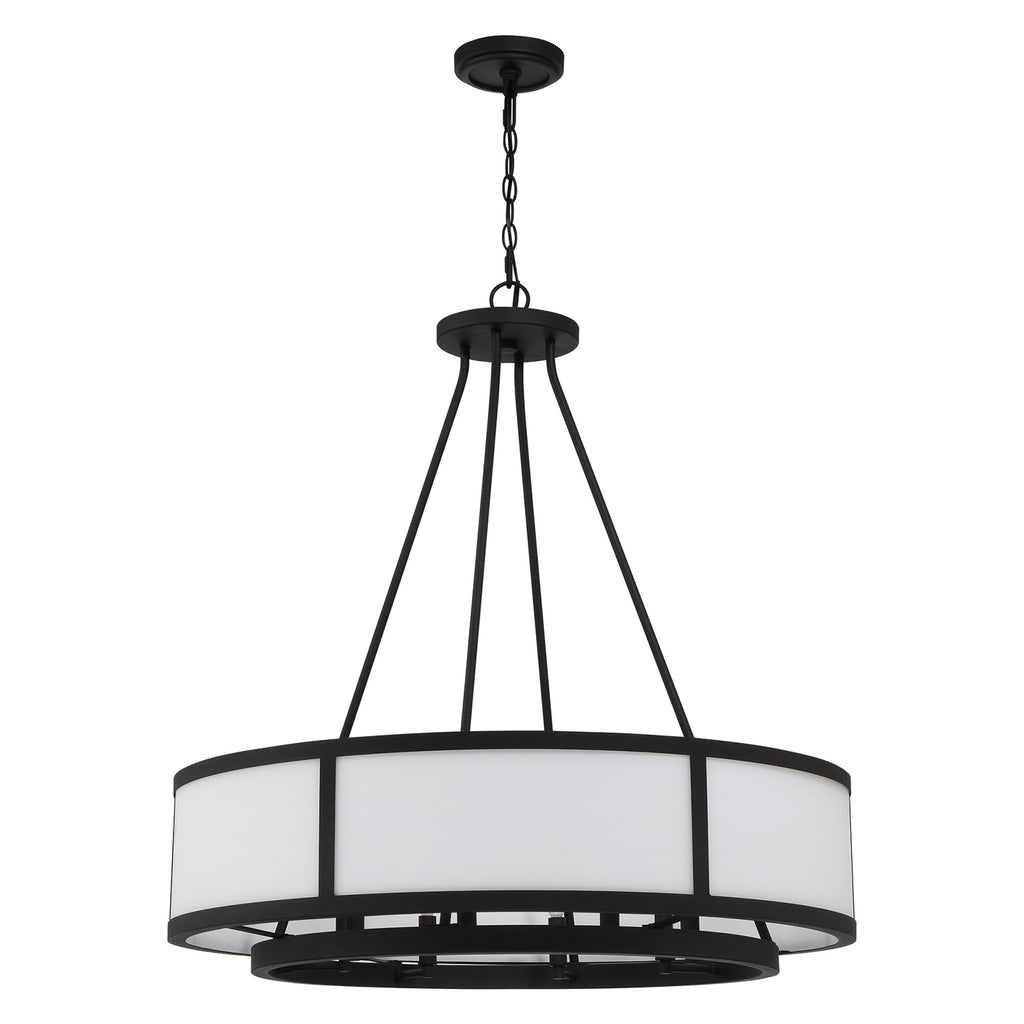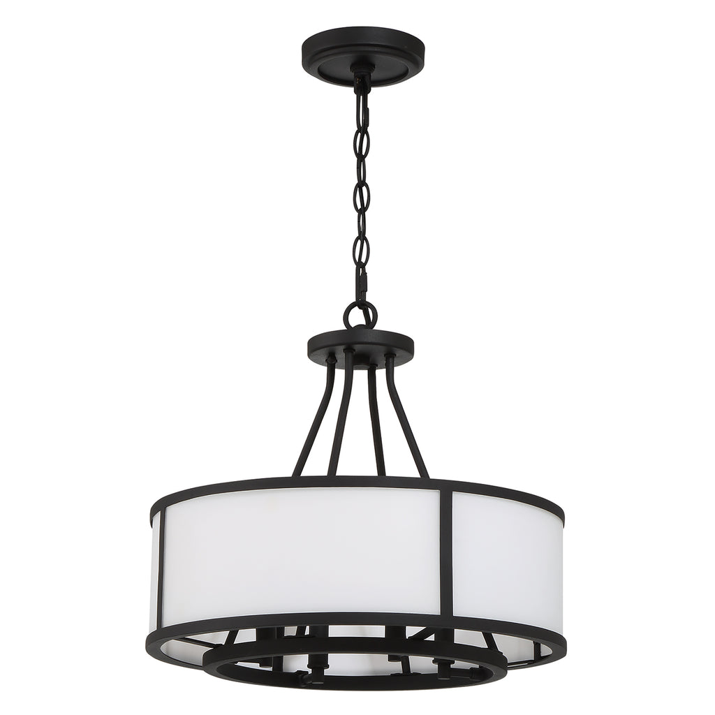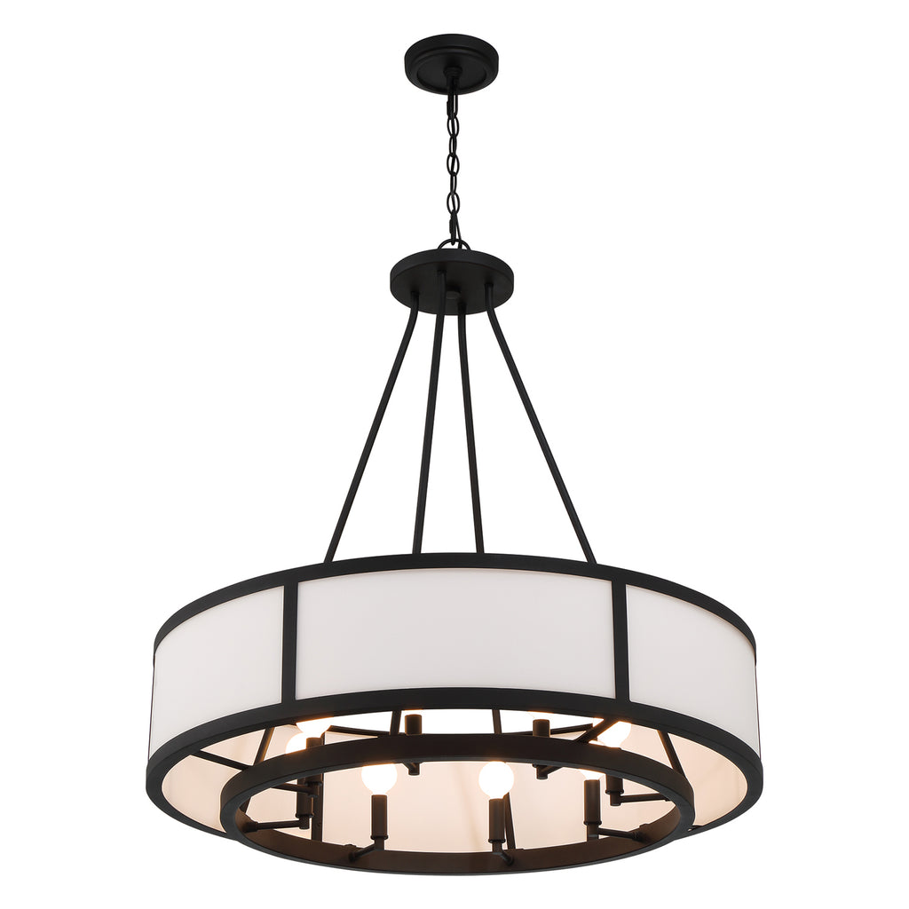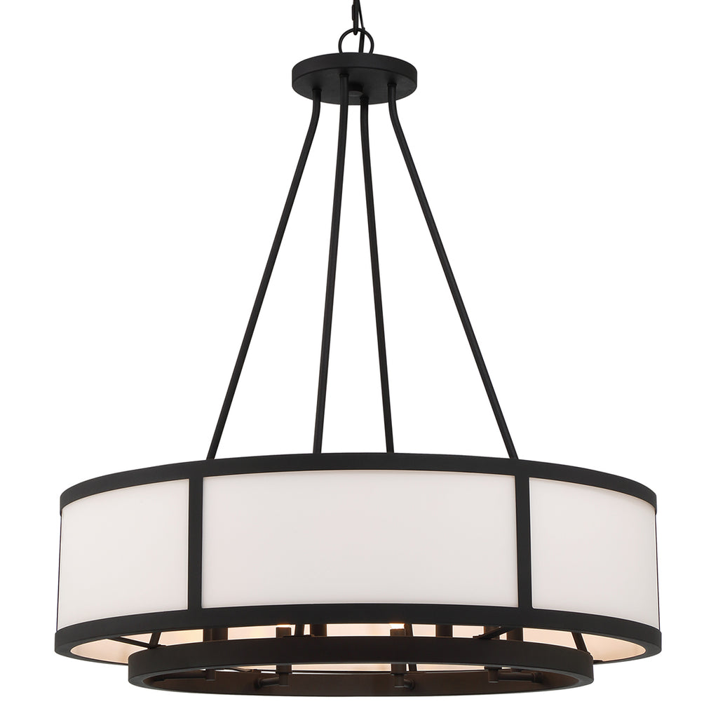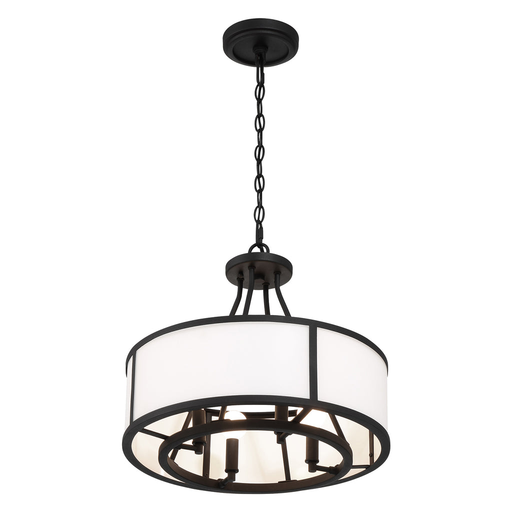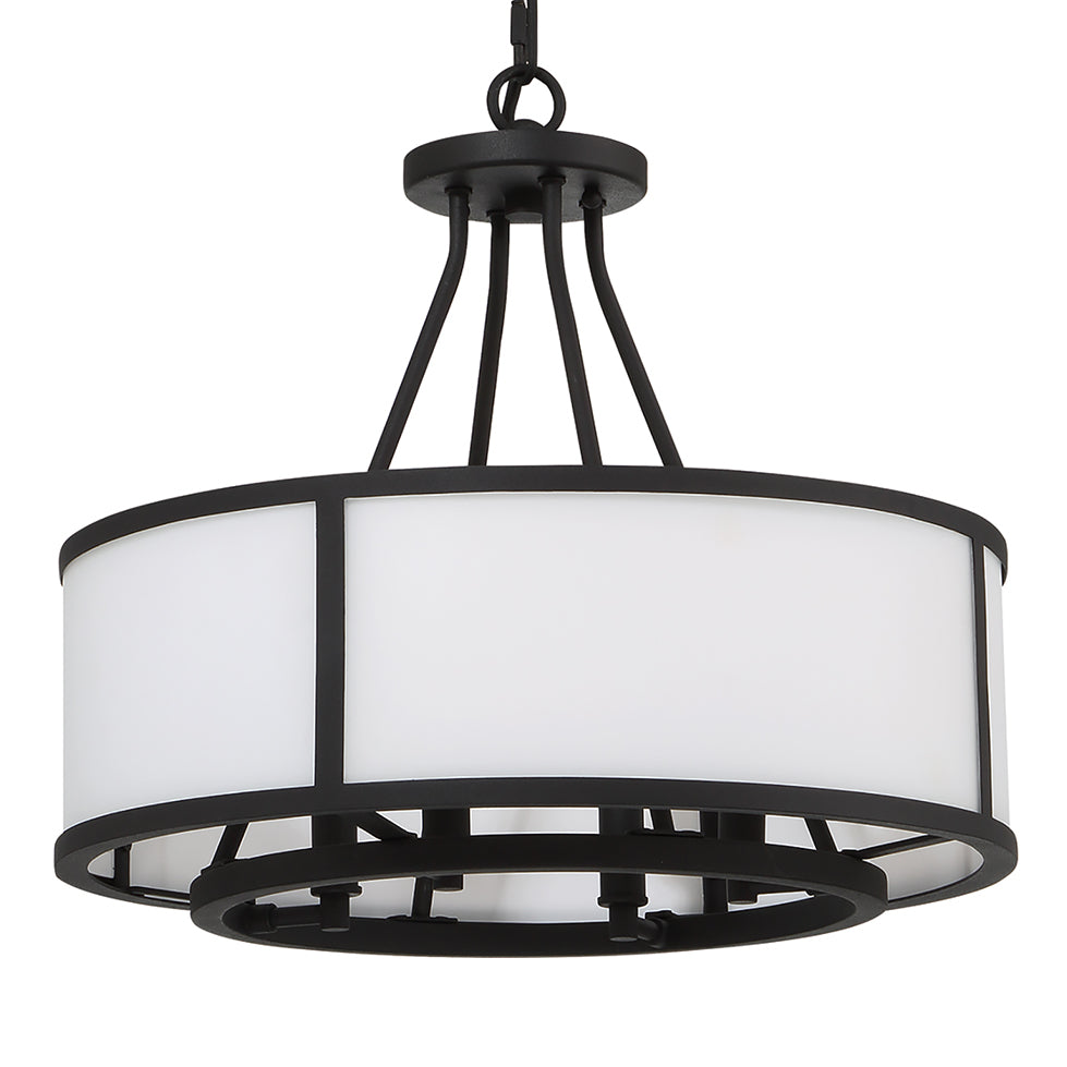 Crystorama is known for its standout lighting, which is exceptional in quality and design. From traditional all-crystal designs to transitional lighting collections, Crystorama offers styles that will match any décor and are always in fashion. Showcasing a classic drum pendant, the Bryant is crafted with a white glass shade and black steel frame. The outer drum surrounds an inner suspension of candelabra sockets. The contrasting materials and bold graphic lines provide a design-driven style and a striking visual accent to many interior settings