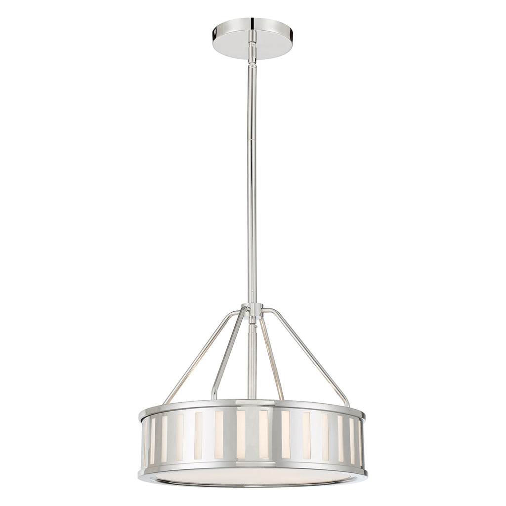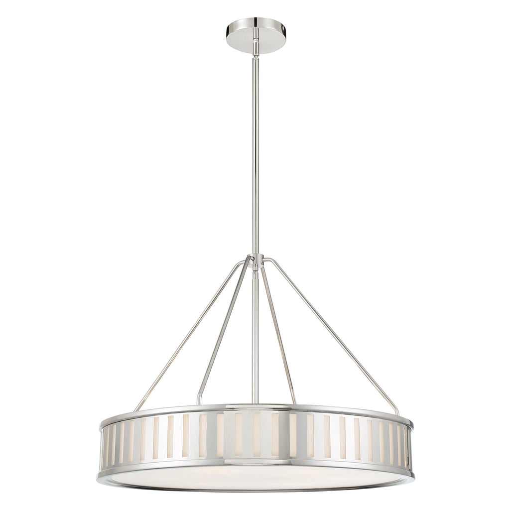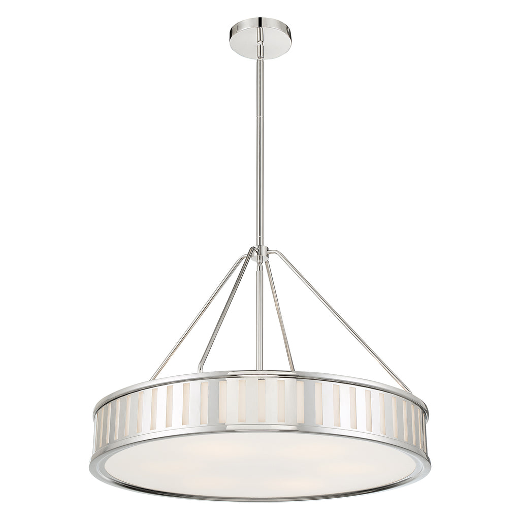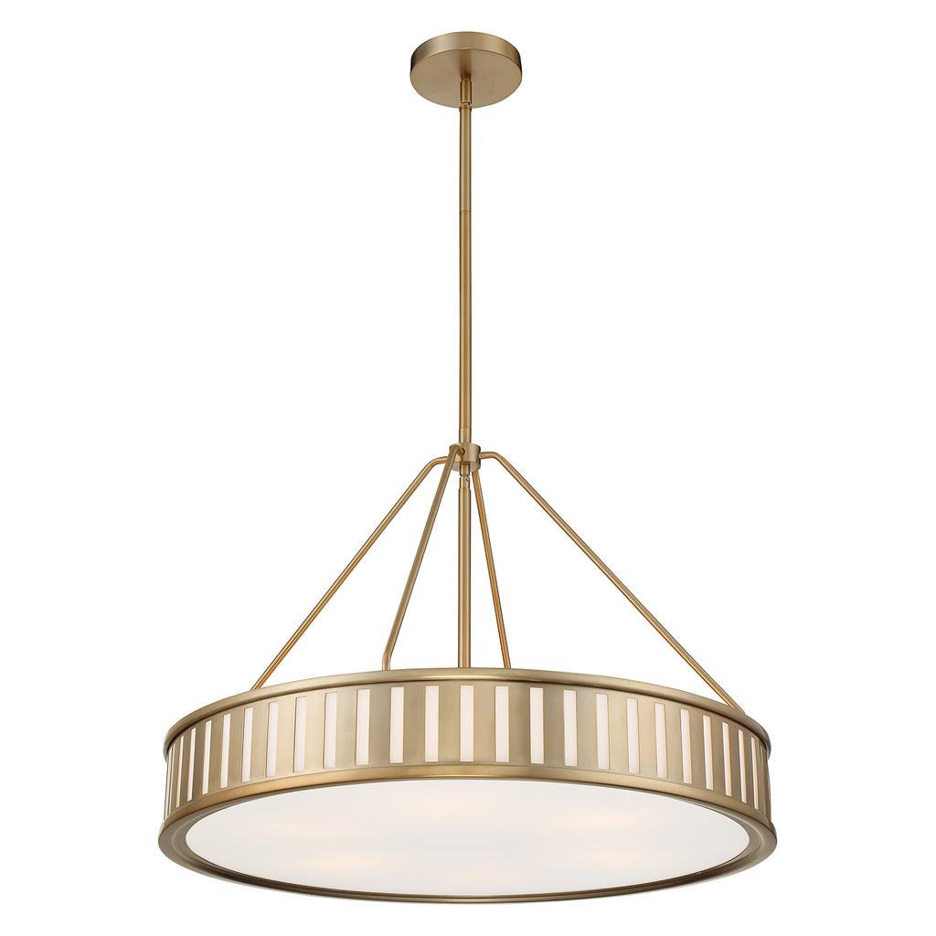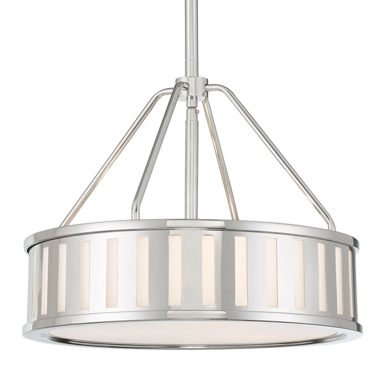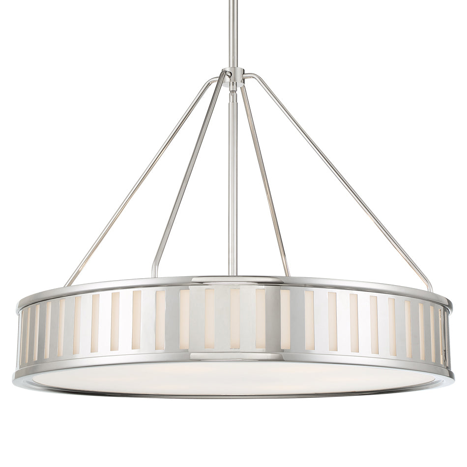 Crystorama is known for its standout lighting, which is exceptional in quality and design. From traditional all-crystal designs to transitional lighting collections, Crystorama offers styles that will match any décor and are always in fashion. The contemporary Kendal collection makes a statement with its graphic uniform pattern. Its metal frame surrounds white glass in this elegant drum-shaped pendant. The high contrast of matte gold or polished nickel against white glass is a great way to add a touch of drama to a room.
