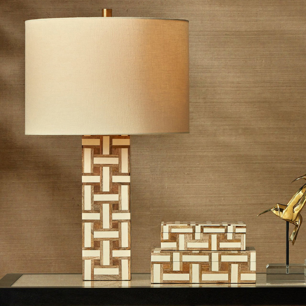 The reactive black and white or cream glaze on the surface of the Fidella Table Lamp is only one of the facets of this design that brings it a jaw-dropping texture. The bubbles that are inherent in artisanal glazing and the striations carved into the body of the ceramic lamp also contribute to the patina. The finial that matches the pear-shaped body's color and fastens the drum shade to the gray lamp completes this interesting composition.