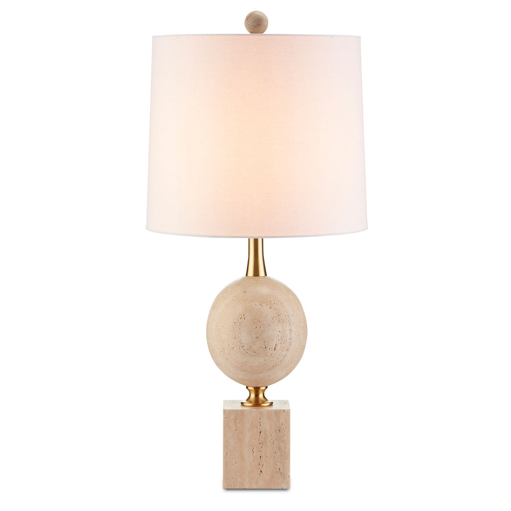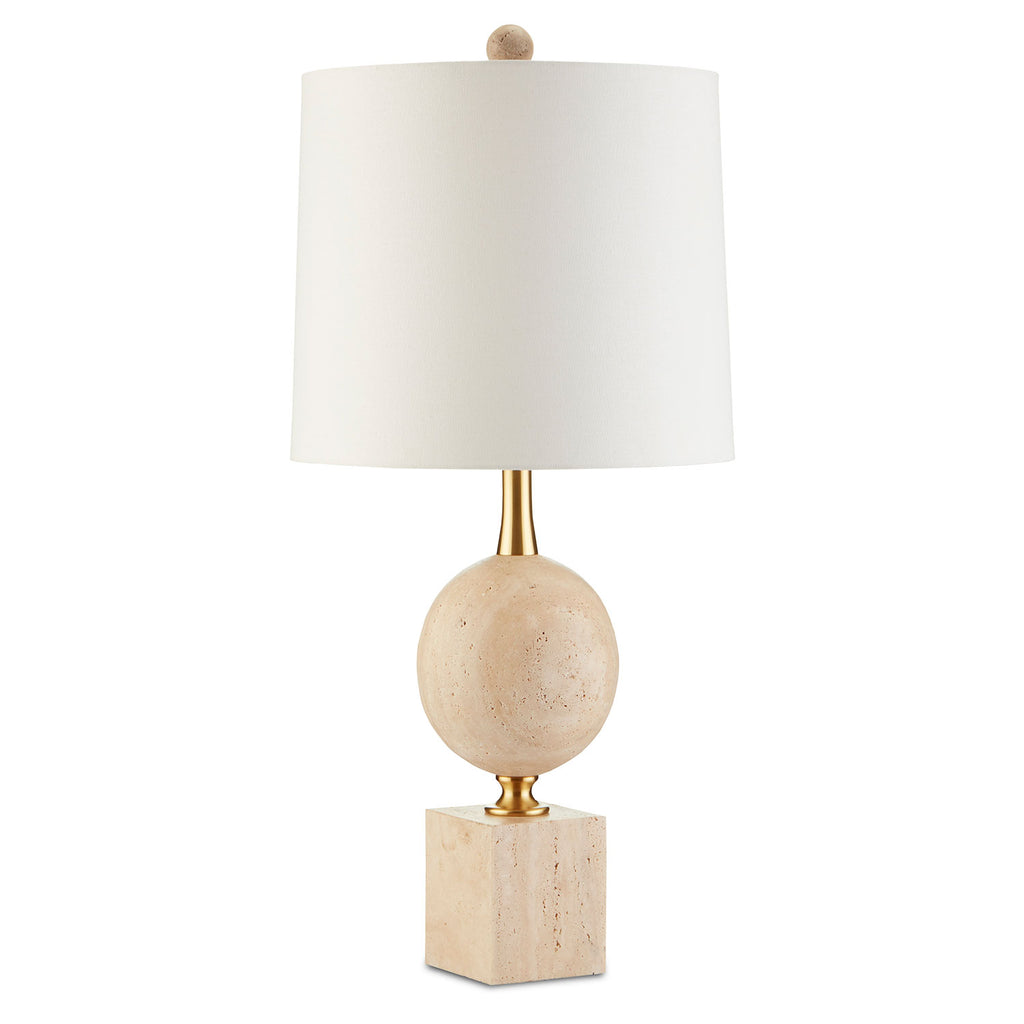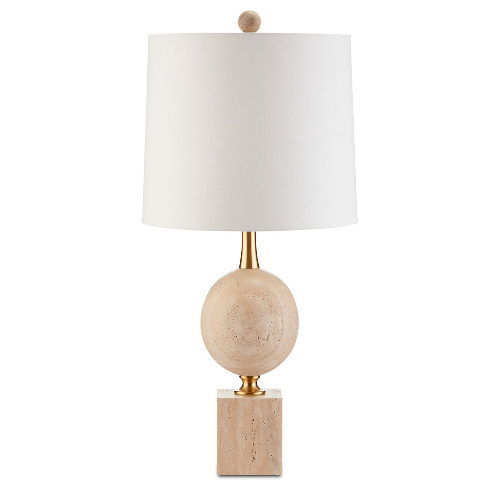 The Currey & Co Adorno Table Lamp is a modern take on a classic design. The beige marble shapes connected by metal elements in an antique brass finish are clean-lined to bring it into the 21st century. The warm finish picks up the darker tones in the veining of the marble to bring texture to the lamp, which is topped with a shade that perfectly reflects the scale of the lamp.