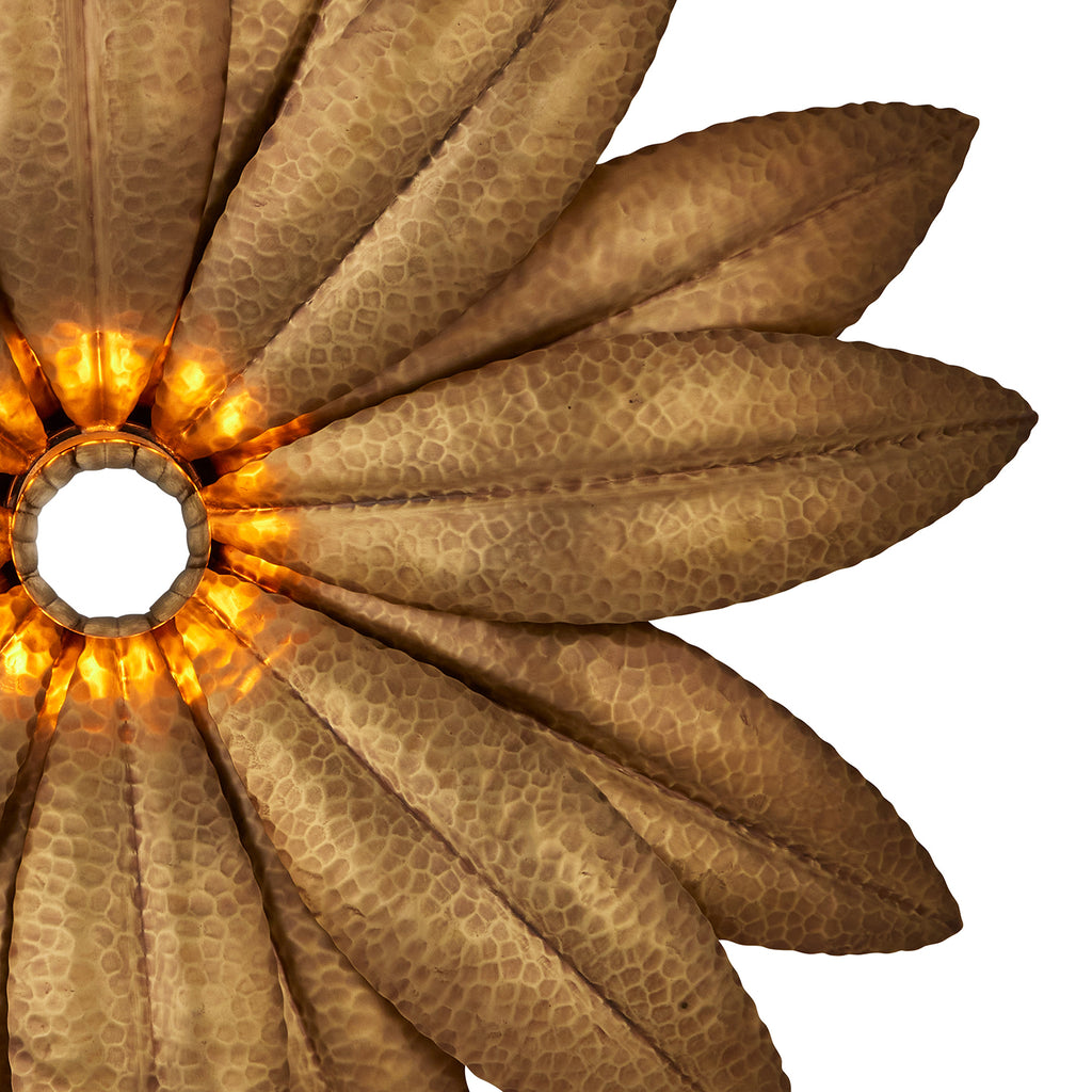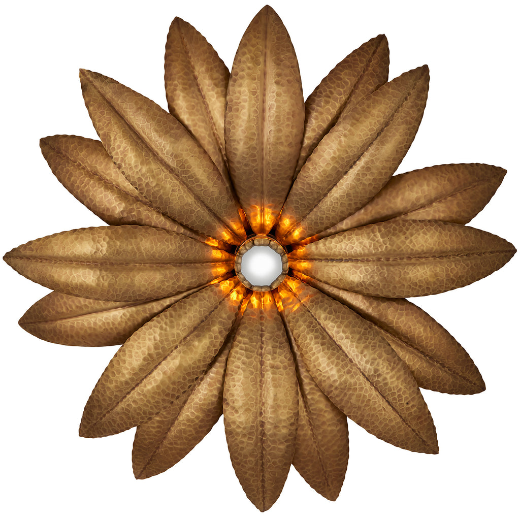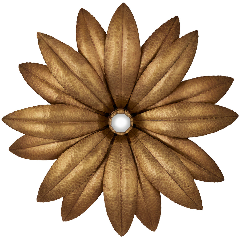 The Currey & Co Alithea Single Wall Sconce is made of brass in an antique brass finish. The petals on this nature-inspired gold sconce have been hand-hammered to give them life-like personality. Designed by Tom Caldwell, the floral sconce will be a pretty addition to any space it illuminates. The button-like bulb brings the metal a luminous sheen.