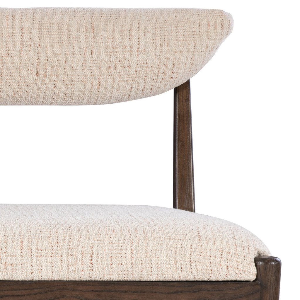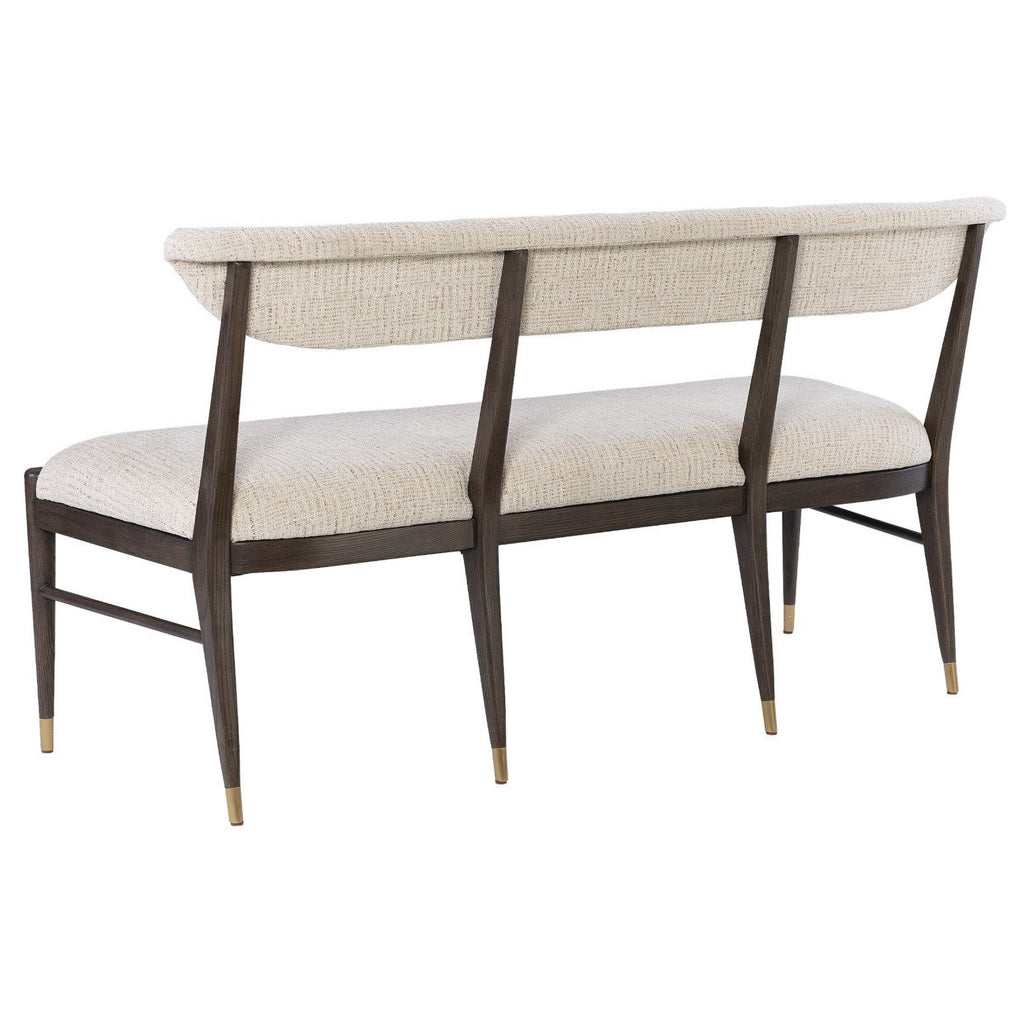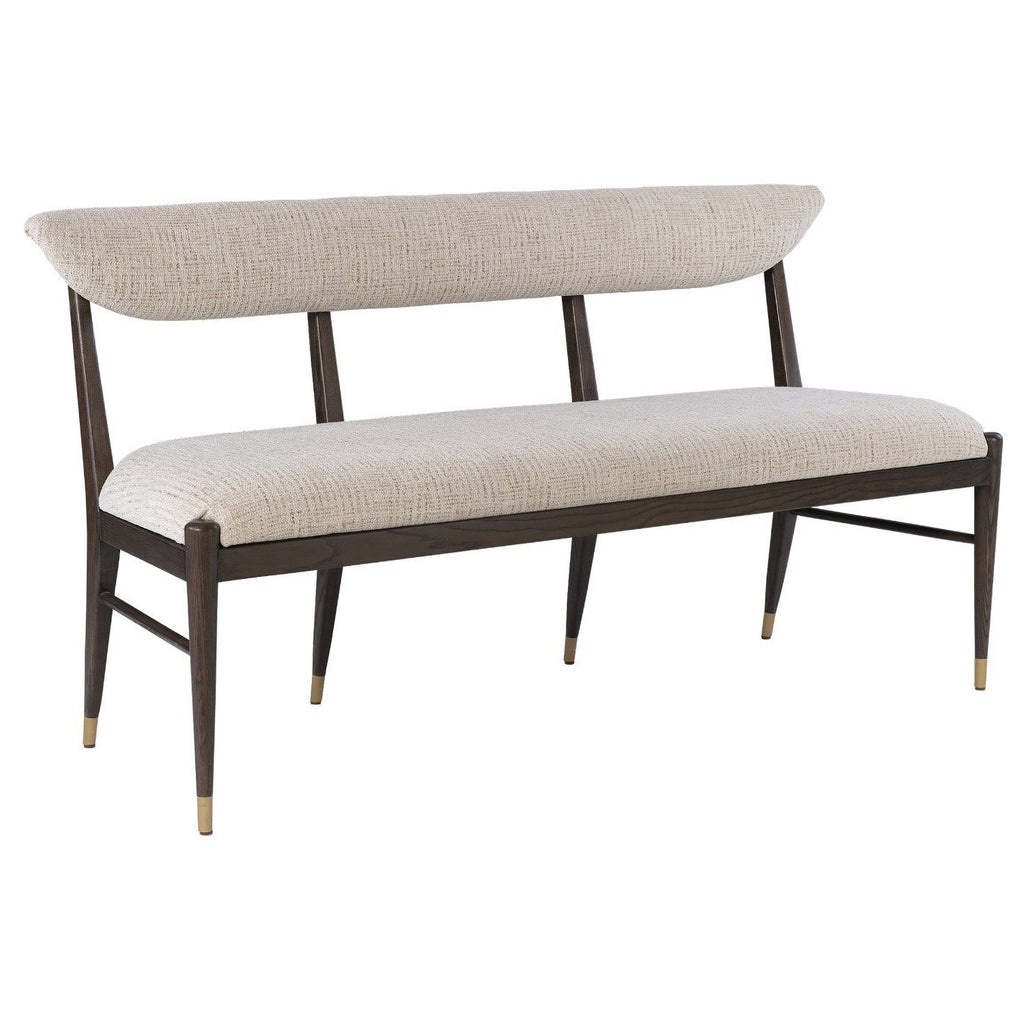 The Arlan Coffee Bench, which is made of ash wood in a coffee brown finish, has tailored contemporary lines. The back and seat are covered in a nubby performance fabric called Busio Desert, and the tapered legs that run along the sides and back are sophisticated design details on this piece of upholstery. The ferrules on the dark brown and white bench are in an antique brass finish.