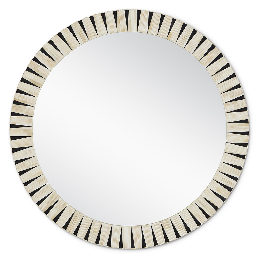 The Arvi Round Mirror has a winning personality thanks to the dynamic mix of ivory bone and black composite that form an interlaced patter. While the black pieces that narrow to a refined point are smooth, the bone sections have been carved in convex rows. The edges of the frame are also carved in larger convex shapes to add interest to the profile of the black and beige mirror.