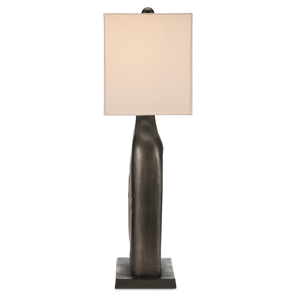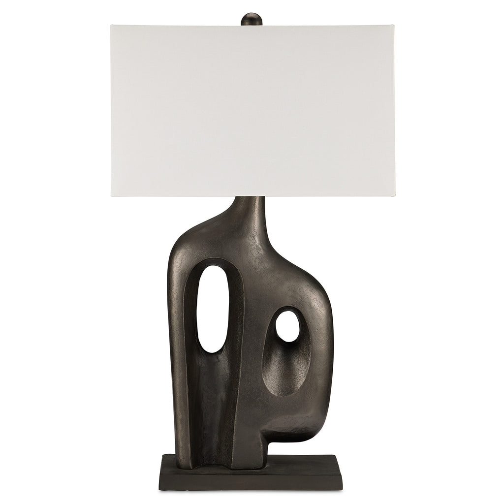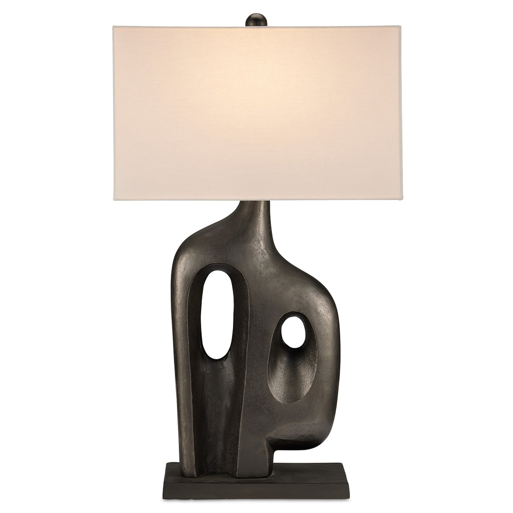 The Currey & Co Avant-Garde Table Lamp has a mid-century-modern inspired body, the flowing form leaning a bit toward brutalist in design. The lamp is made of aluminum in a graphite finish that brings the profile heft. The base and finial match the sculptural piece, and the bone linen shade is a pale contrasting element.