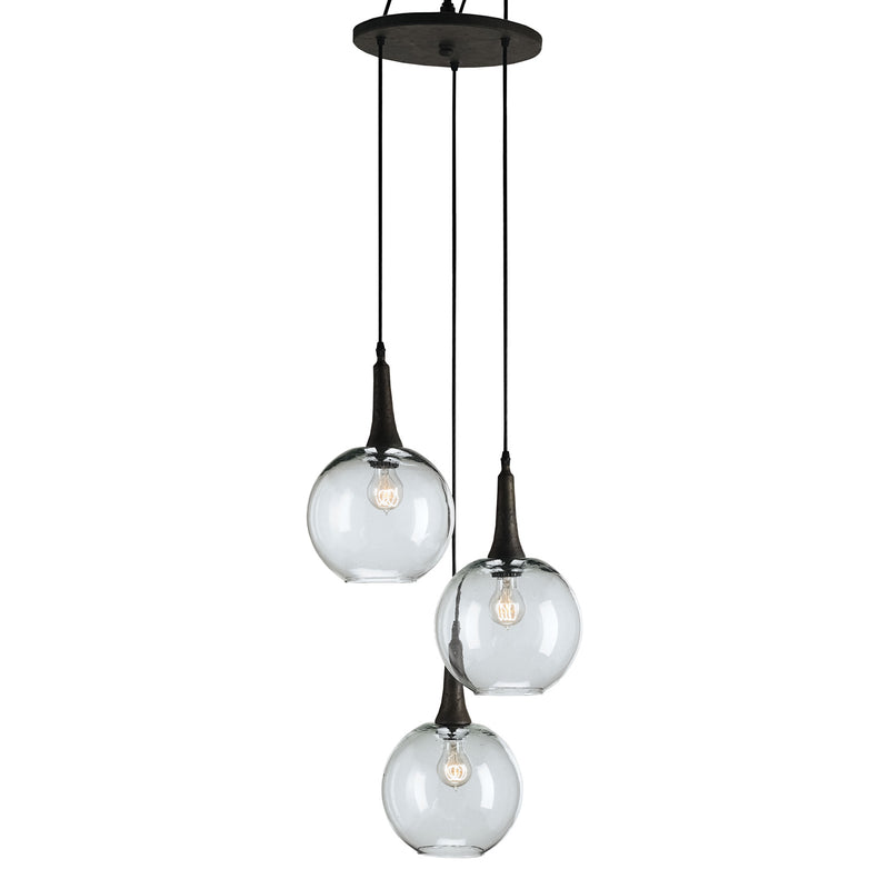 Voluptuous glass spheres dangle at differing heights from the canopy of the Beckett Trio Pendant, its wrought iron elements treated to an Emery rust finish. The mid-century modern vibe of this light fixture is heightened by the glass globes that measure 9 inches in diameter. The Beckett has an adjustable hanging length and there is also a one-globe pendant in the Becket family of fixtures.