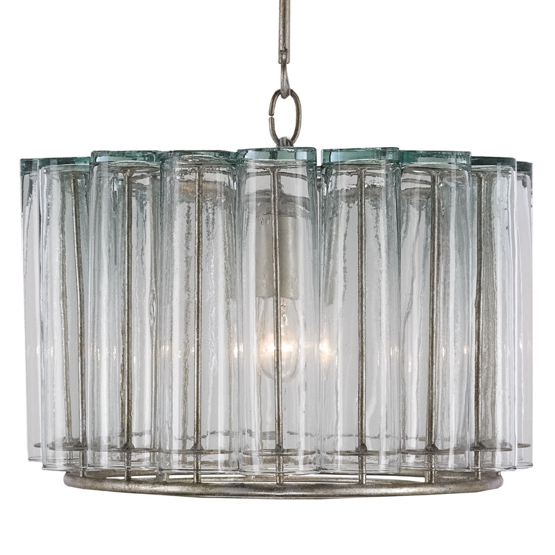 The Bevilacqua Pendant is a magnificent toast to good taste. Filled with luminosity and grace, its reflective glass flutes are made from recycled bud vases. Its wrought iron frame is finished in an exquisite silver leaf that compliments the hues in the glass. This one-light pendant is one in a variety of fixtures in the Bevilacqua collection.