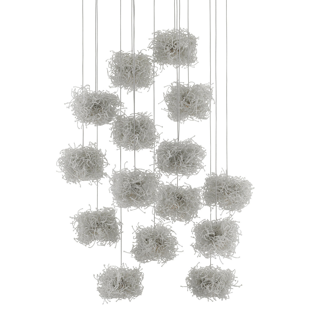 The Currey & Company Birds Nest Round 15-Light Multi-Drop pendant is an effervescent beaded pendant that looks like luminous nests. Rather than twigs, the shades are made up of whorls of clear beads strung along pieces of wire.