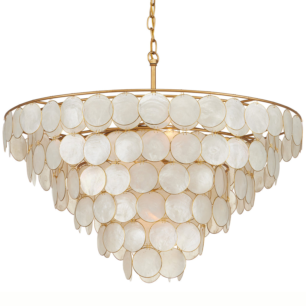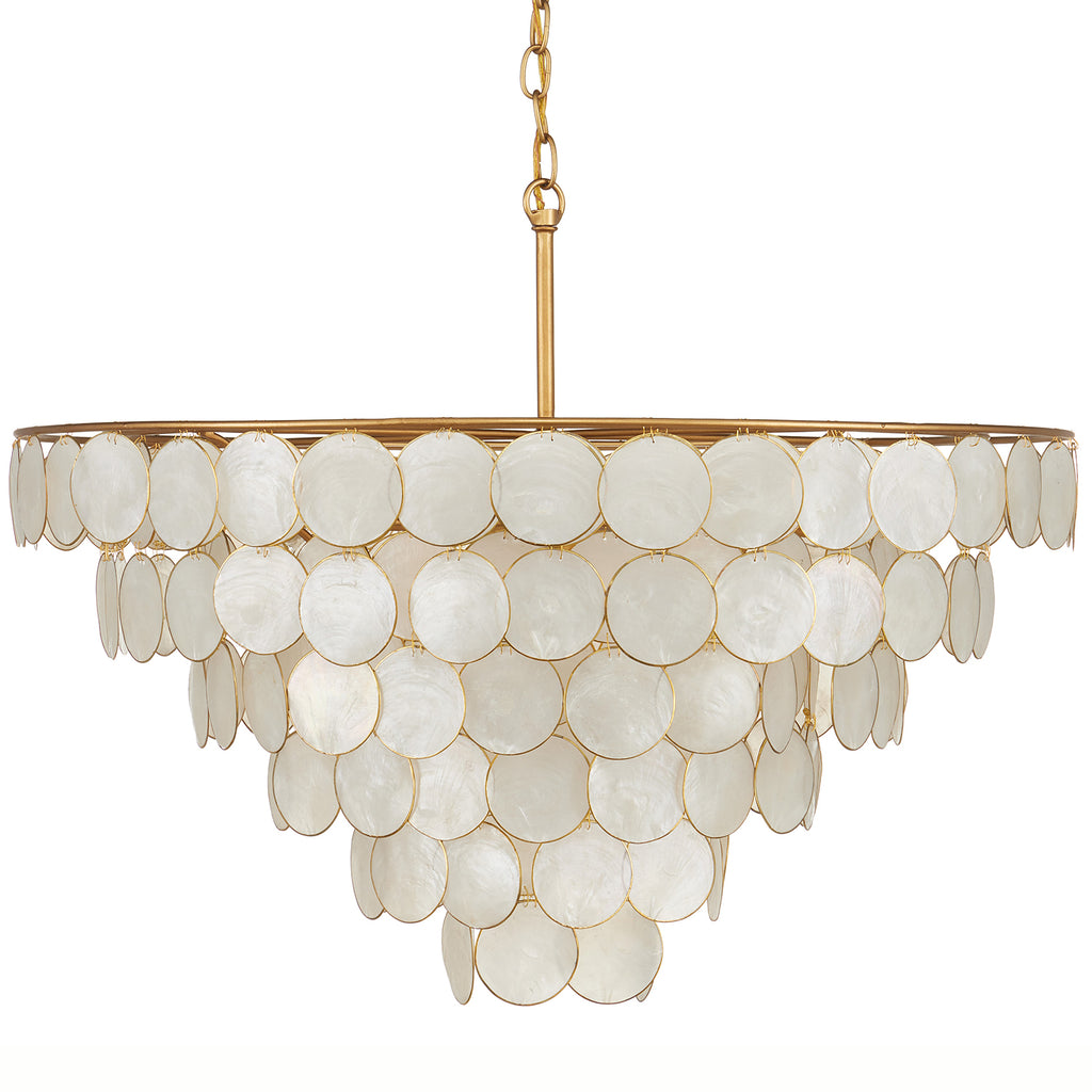 Ethereal in its overall vibe, the Currey & Co Bon Vivant Large Semi-Flush Mount was designed by Tom Caldwell. The discs that effervesce with illumination are made of Capiz shells ringed in a decorative metal edge that matches the gold finish on the rest of the fixture. The thinness of the wires that fasten the discs to the frame and to each other is a sophisticated design detail. This gold semi-flush is convertible to a chandelier when the lower canopy is removed.