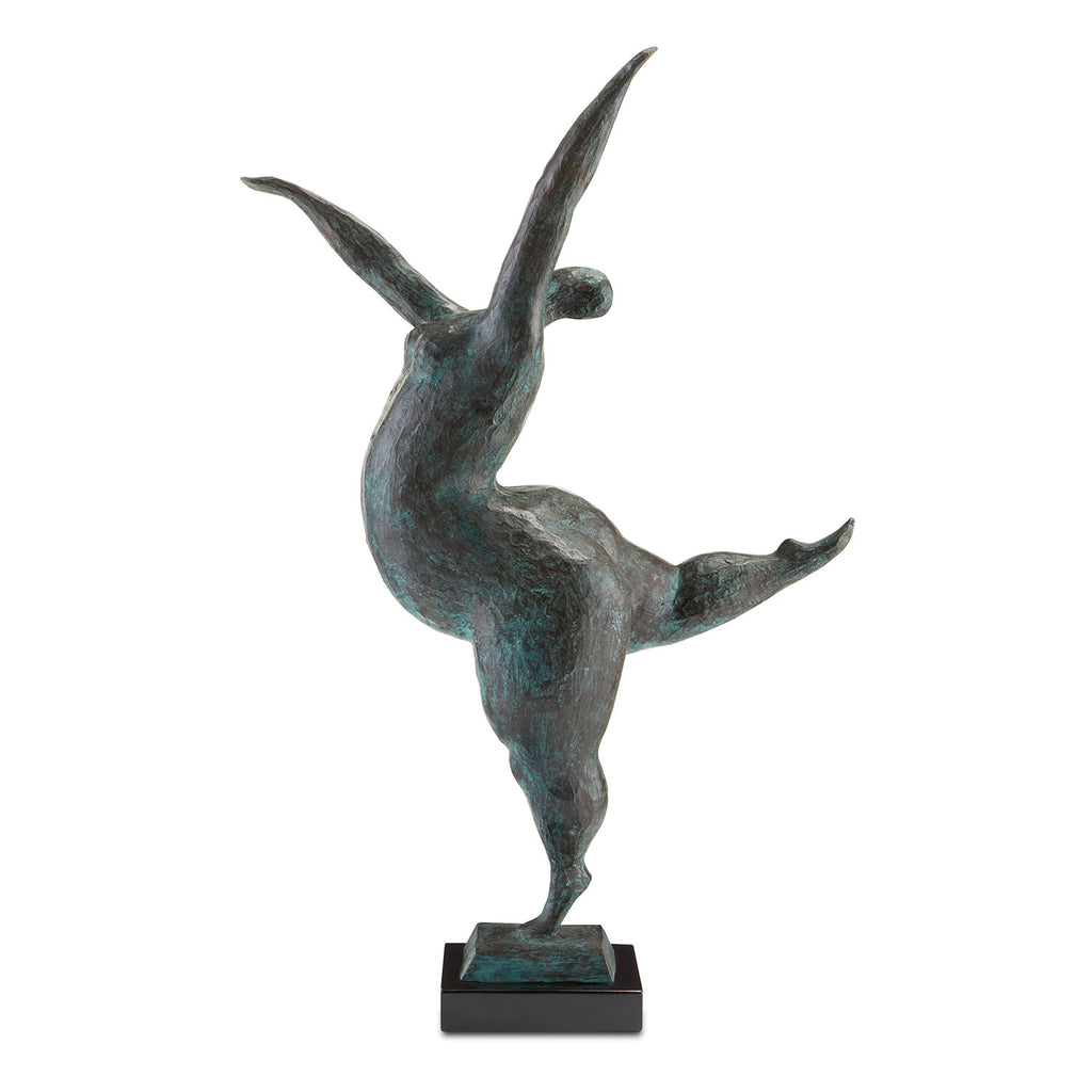 The exuberant Currey & Co Butterfly Ballerina Bronze sculpture is made from a lost-wax technique when boiling bronze is poured into a mold covering an original wax sculpture that melts away. Once set, there is a very long process of refining the bronze to give it patina. This is among our bronze art pieces created by an unknown artist.