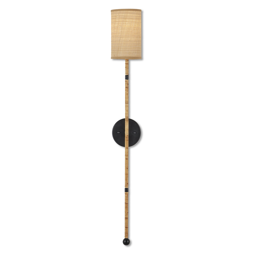 A seriously clever design, the Capriole Rattan Wall Sconce looks as if it is made of a floating stem of natural material when viewed from the front, but when seen from the side, the bow-shaped hardware that attaches it to the backplate creates a dynamic design detail. The way the minimal metal bands clasp the stem creates further interest. To contrast the natural rattan, Clarence Mallari, the designer of the fixture, chose a satin black finish for the metal.