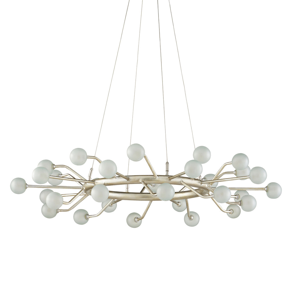 The Currey & Co Chaldea Chandelier has a space-age appeal with its arcing arms that hold frosted globes. These are made of recycled glass and fitted with LED bulbs to make it an environmentally conscious design with planetary aspirations. The metal is in a contemporary silver leaf finish and the fixture is hung on aircraft cable, both coalescing to bring a lightness to this silver chandelier.