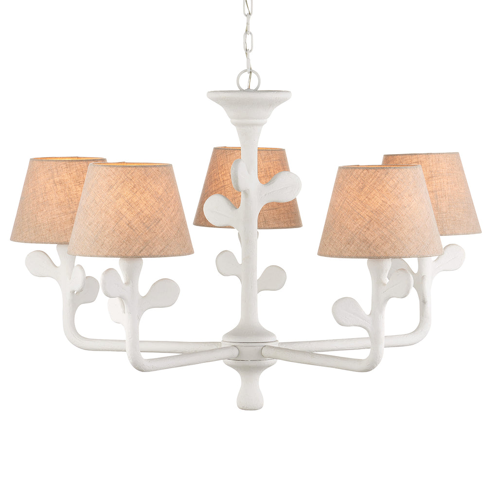 The playful profile of the Currey & Co Charny Chandelier makes this a charming addition to a room. The white chandelier is made of composite with a White Gesso finish. The leaf-like shapes that extend from the stems of the Charny make this a terrific luminary for a space inspired by nature. The textural natural shades made of coarse linen add a dash of warmth to the design.