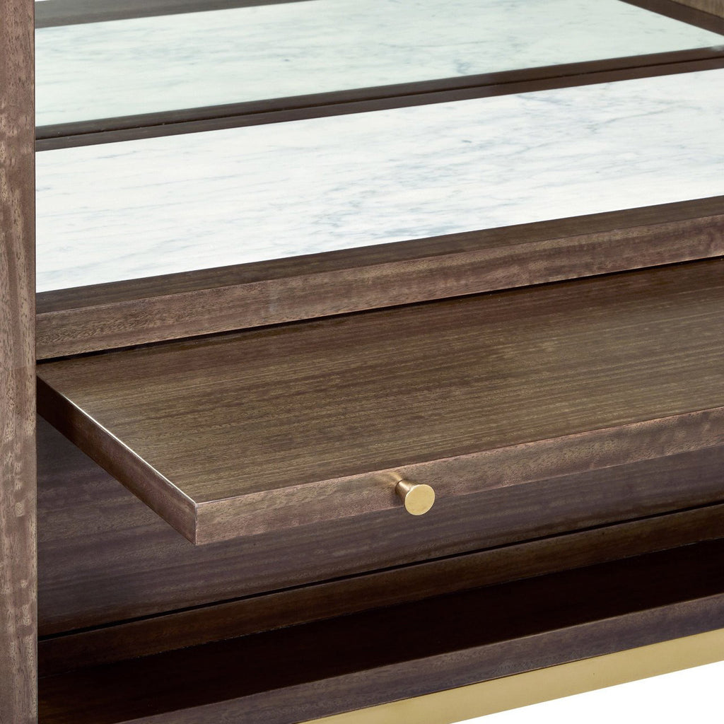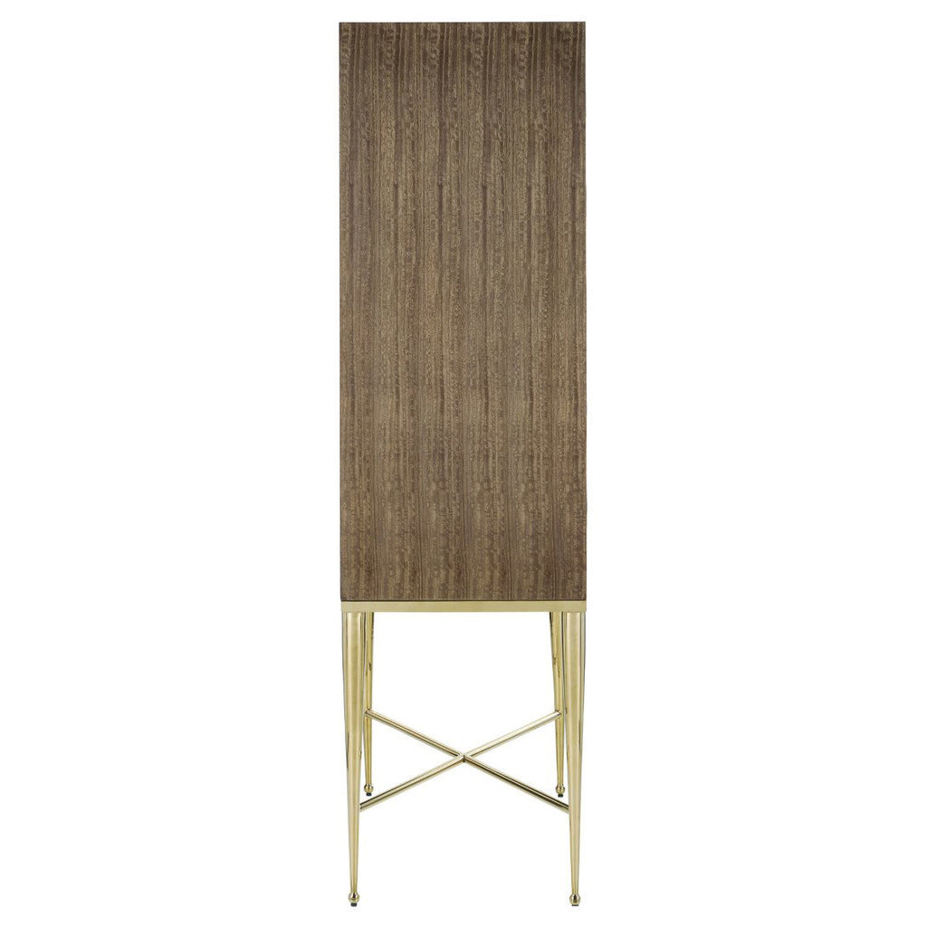 The Colette Bar Cabinet is made of poplar wood that is covered in Eucalyptus veneers with a handsome linear texture to them, heightened when finished in a tawny brown. Elevating the sophistication of the two-door cabinet is a high-gloss luster on the exterior. Interior details include a mirrored back, two glass shelves, an inset marble slab on the bottom surface, a pull-out tabletop for additional work/serving space, and a large drawer for storing accessories. The luminous beveled mirror accents on the doors and interior drawer, which sit proud on the surface of the cabinet, are surrounded by stainless steel rings in a polished brass finish to match the legs and the stretchers.