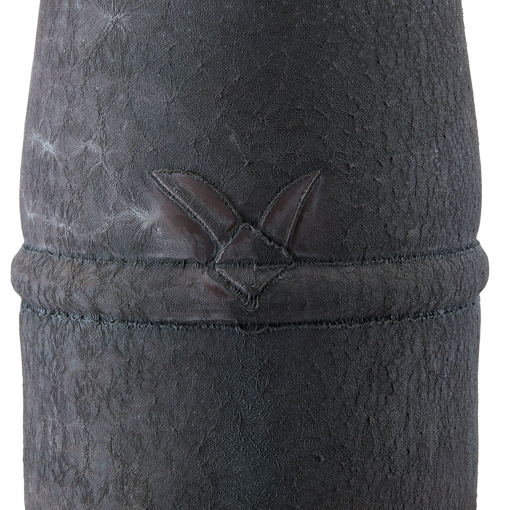 Designed by Clarence Mallari, the Currey & Co Croft Table Lamp is a rough luxe offering made of ceramic in a satin dark gray finish. The textural surface has a slight curve as it nears the shade, a central ring that bulges from its profile, and a very subtle leaf motif that is carved into its body at intervals. The pitting on the surface of this dark gray lamp will be a textural introduction to a space.