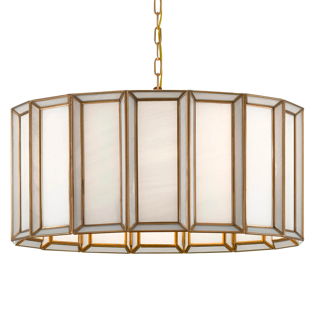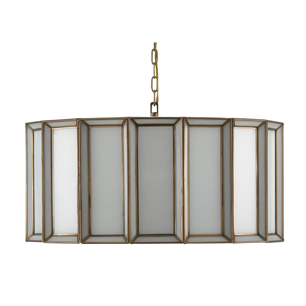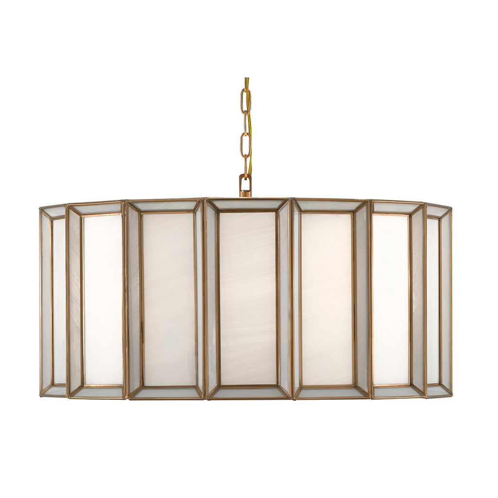 When a soft glow is desired, milk glass is one of the best materials to diffuse illumination. The Currey & Company Daze pendant is made of articulated panels of white milk glass that are joined together by ribs of metal in an antique brass finish. This white pendant will turn luminous when it is switched on.