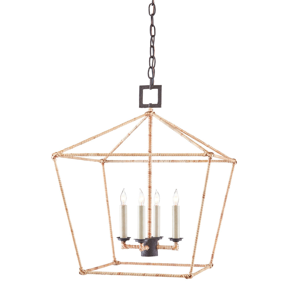 The Currey & Co Denison Rattan Small Chandelier is a hammered wrought-iron fixture in a Molé black finish that is wrapped in rattan. The classic lantern shape has stood the test of time to make it one of the most popular Currey & Co offerings. A design element of note is the square that fastens the chandelier to the chain.