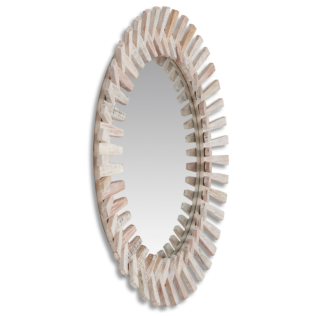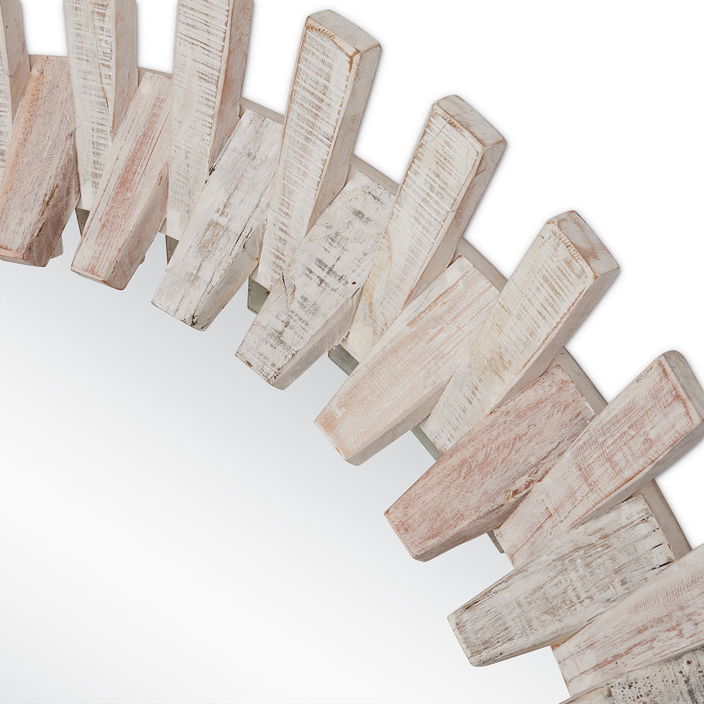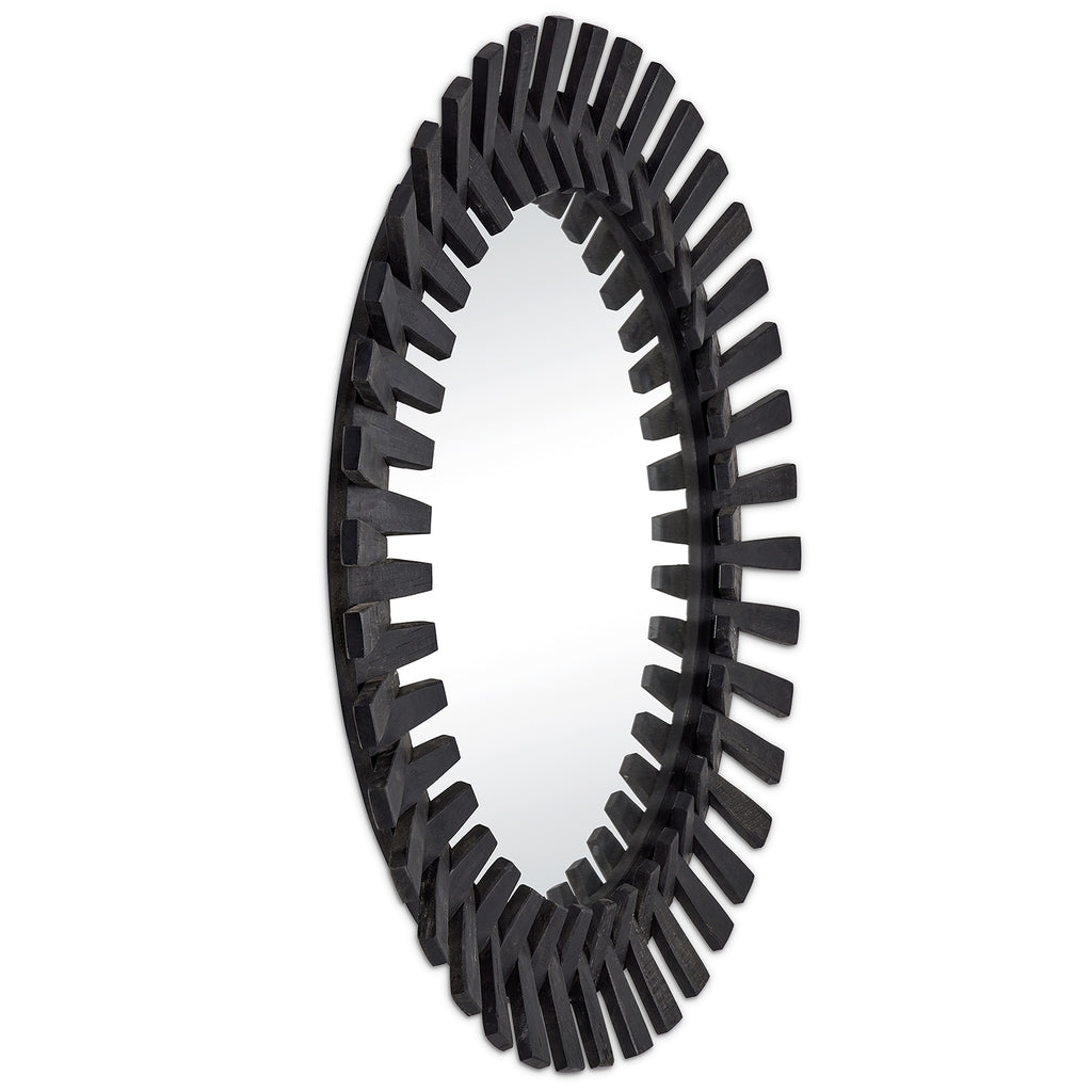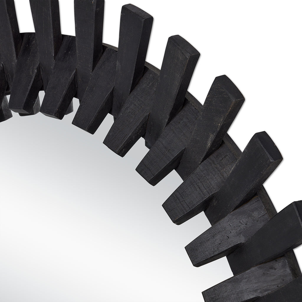 The Diza Round Black Mirror has a profile that is just as interesting from the side as it is from the front. This is because the wood pieces, which taper and are fitted in by hand, splay outward on both the exterior and the interior of the black mirror. The depth this creates will make the decorative mirror a commanding element in a space. Both the very subtle crackle effect created by the woodgrain and the shape are textural details.