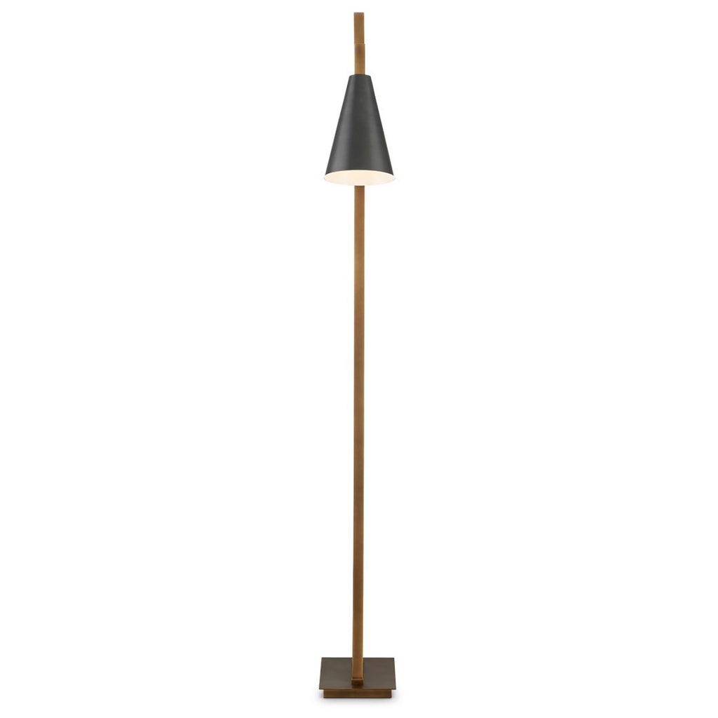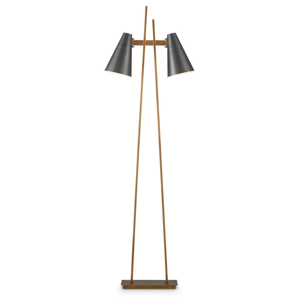 The Currey & Co Duet Floor Lamp has a pair of shades are aimed to give two readers the perfect amount of light when the lamp placed between two chairs. A design detail of note is the asymmetry of the two metal bars that rise up from the base, all in an antique brass finish. The contrasting fixed shades, in an oil-rubbed bronze finish, have white interiors for a brighter glow.