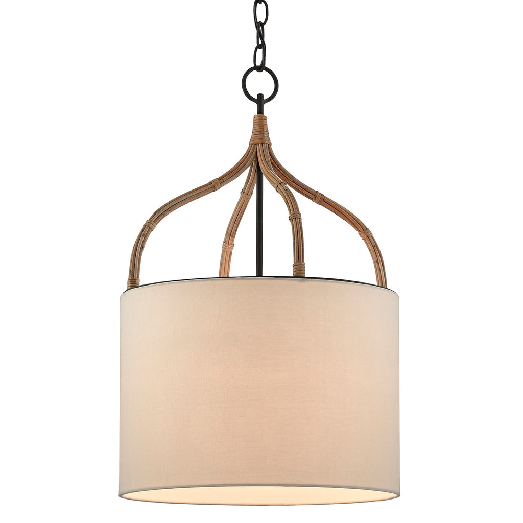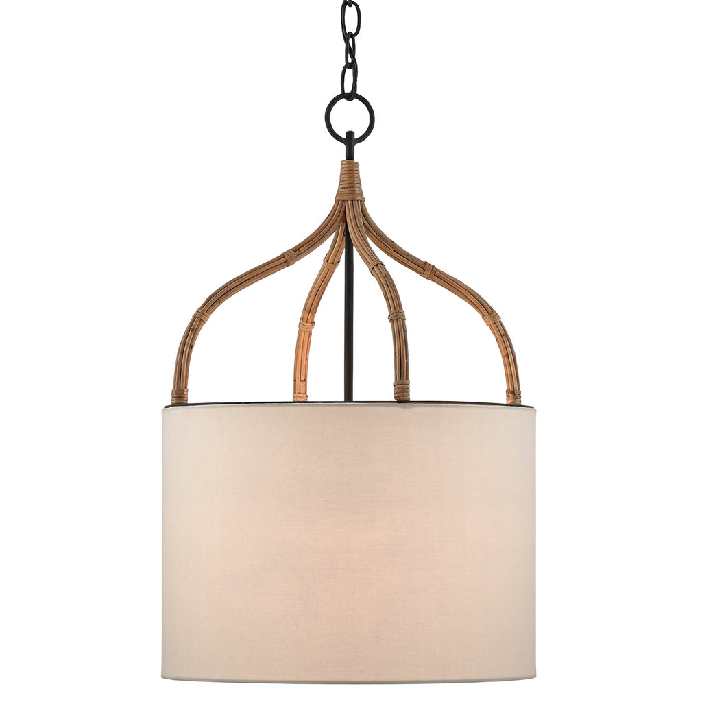 Lantern-like shapes and rattan have been symbols of Palm Beach style for centuries and the Currey & Co Dunning Pendant is a circular take on the tried-and-true design. Made of wrought iron in a blacksmith finish, the curvaceous stems radiating from the frame are wrapped in natural Arurog. The way the frame of this pendant clasps the off-white eggshell shade is a design note that brings this fixture such high style.