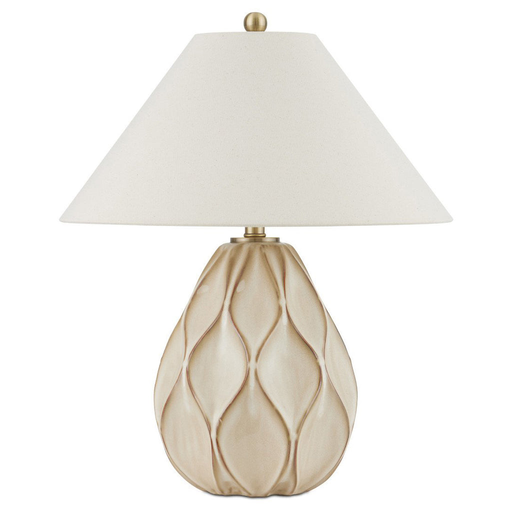 The undulating pattern on the pear-shaped body of the Edgemoor Table Lamp is reminiscent of macramé. Made of ceramic covered in a mix of beige and dark brown glazes, the peaks on the lamp stand out because they've been rubbed to show the deeper tones underneath. The hardware on this beige lamp is in a light antique brass finish, as is the finial.