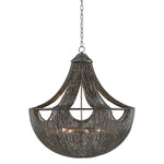 This unique scallop pattern transforms the bell-shaped chandelier from typical to exceptional, the effect created when strands of thin iron wires are wrapped continuously around the circular form and swaged from its top canopy. Welded onto the striated metal strips, which have been left natural, are hints of brass that glint like gold when light strikes them. The six-light Eduardo Chandelier is a chic fixture that swings effortlessly from masculine to feminine design styles.