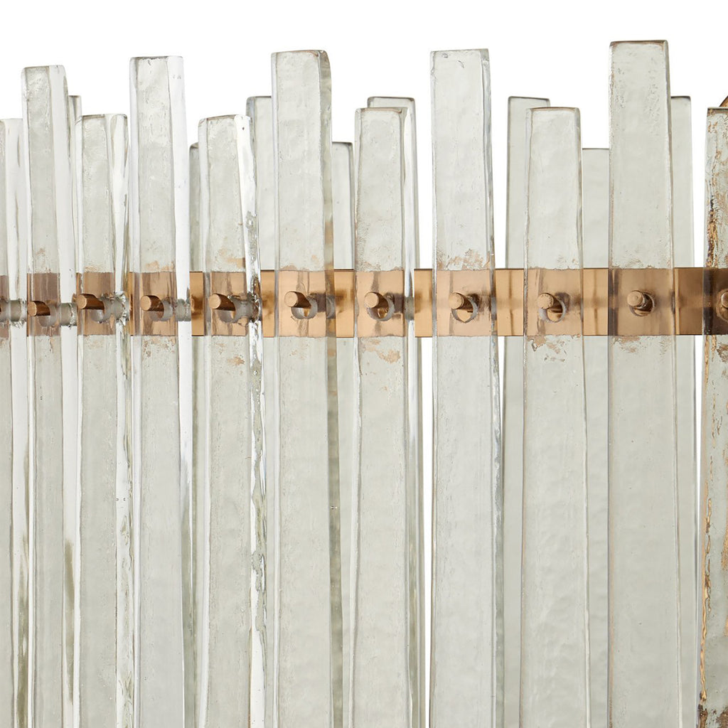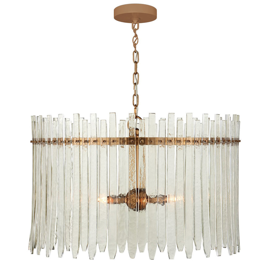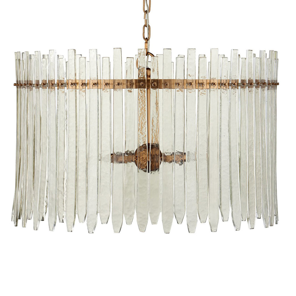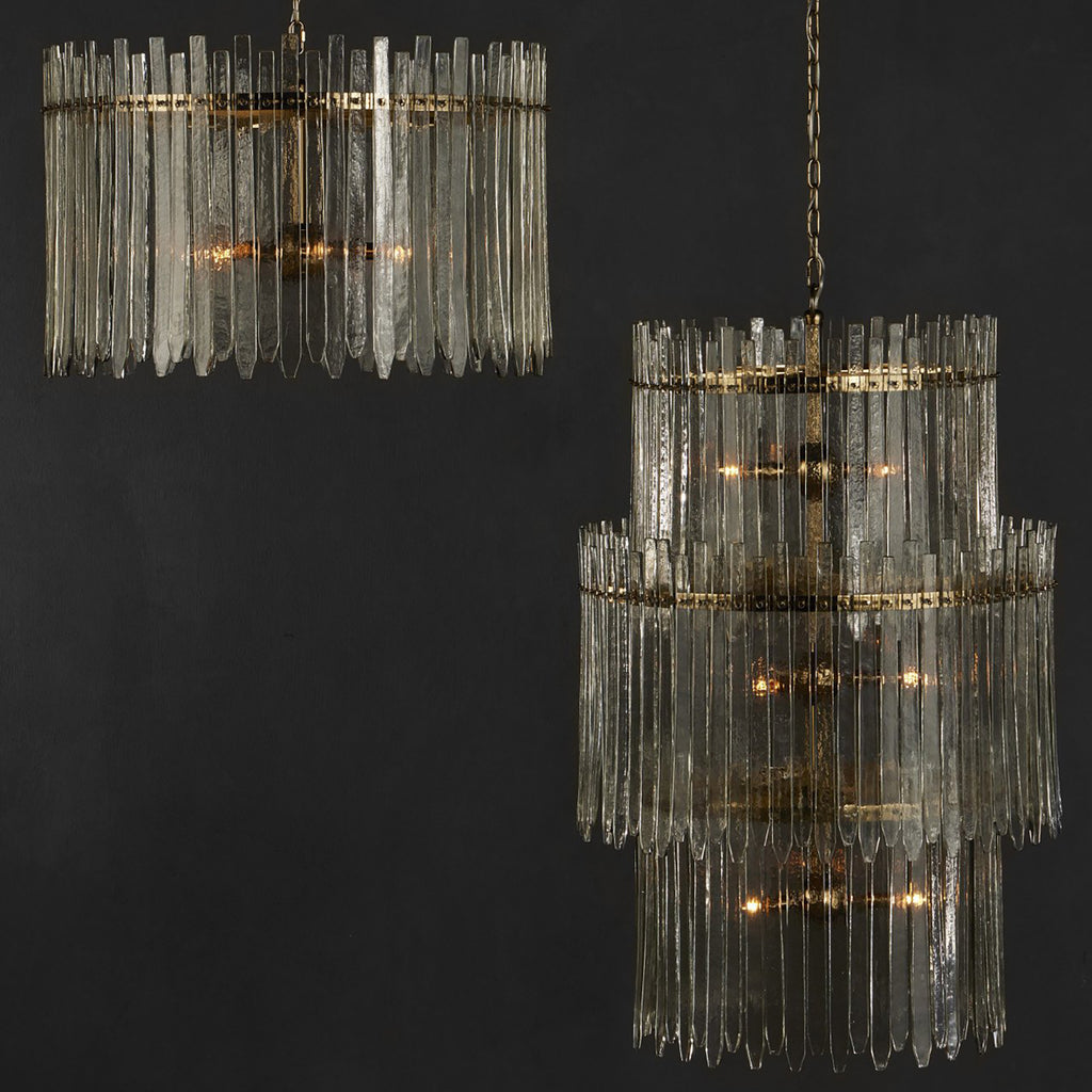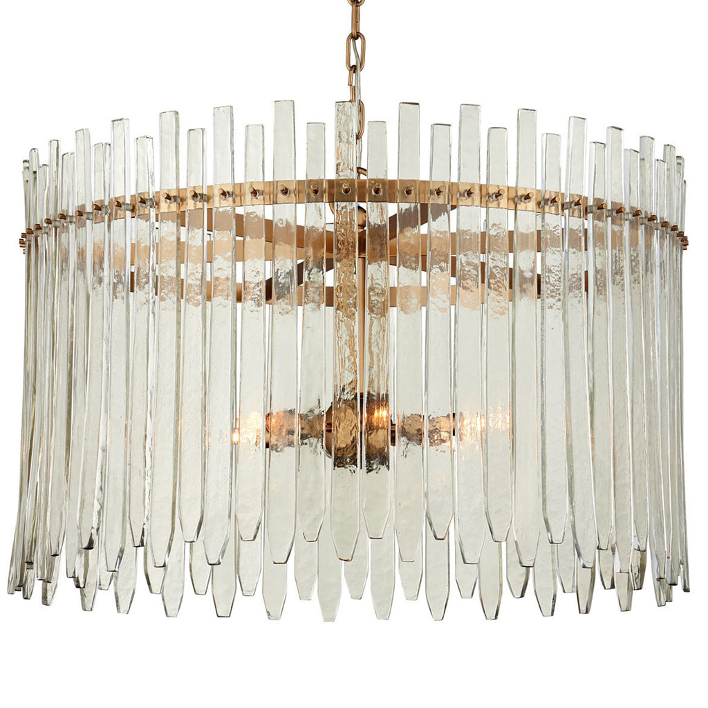 The Currey & Co Electra Chandelier is a luminous composition dripping with two sizes of glass bars that resemble icicles affixed to a antique brass metal frame. The warmth of the gold contrasts the coolness of the glass to create interest, as do the handmade glass pieces themselves, which slightly curve in spots as they flow downward.