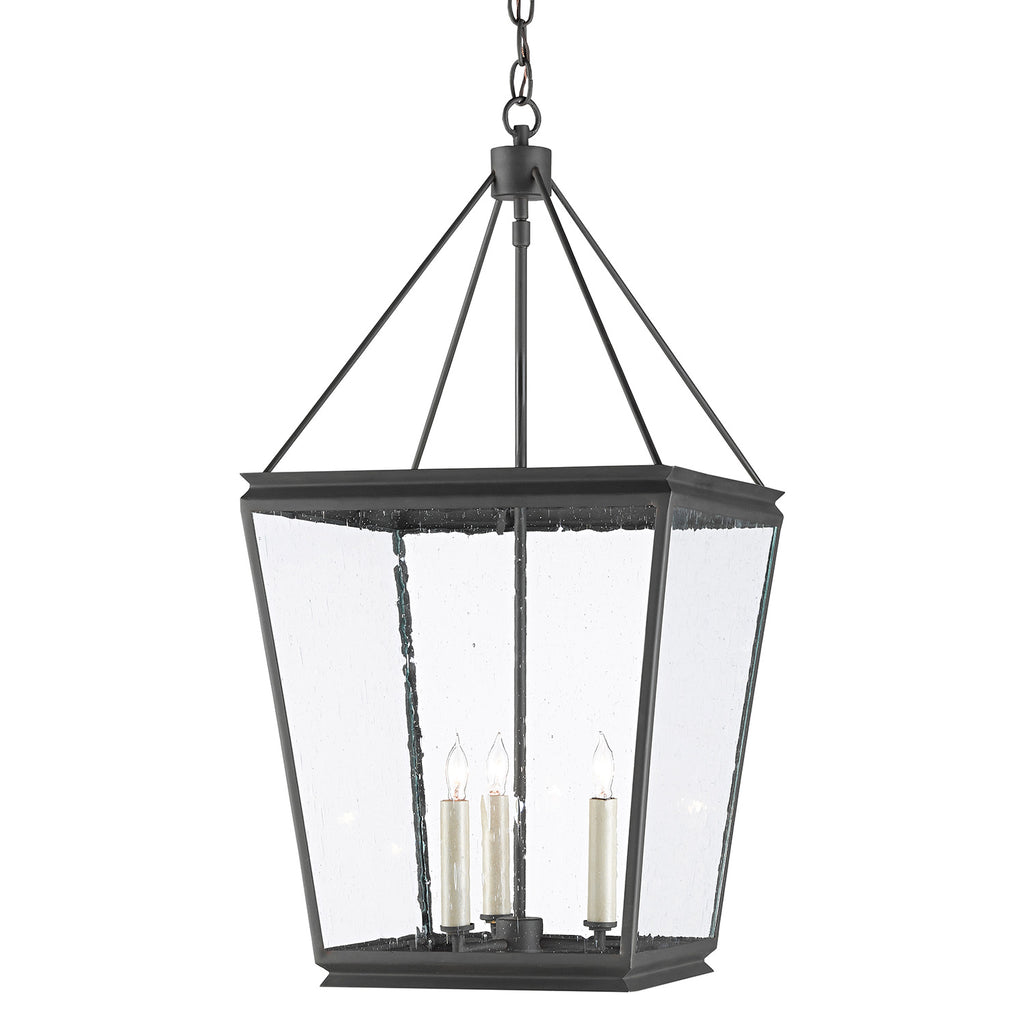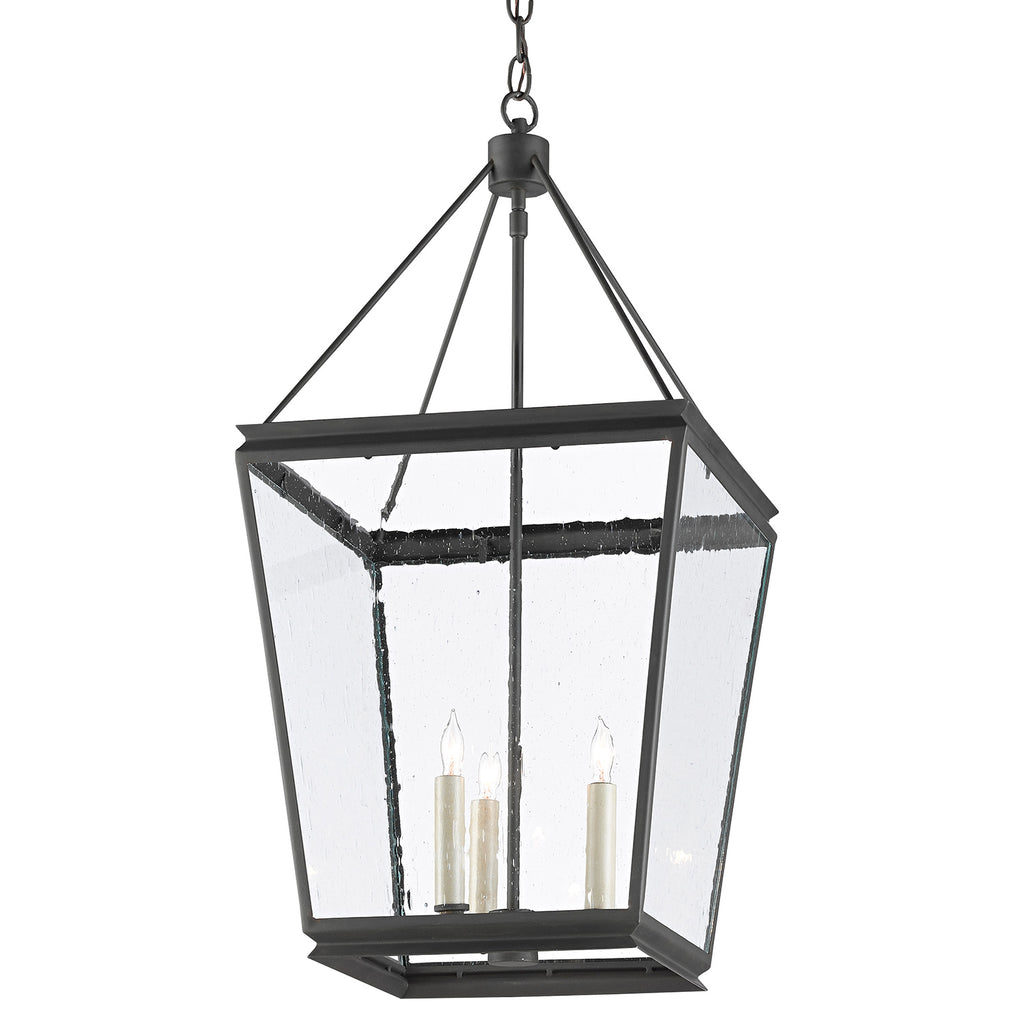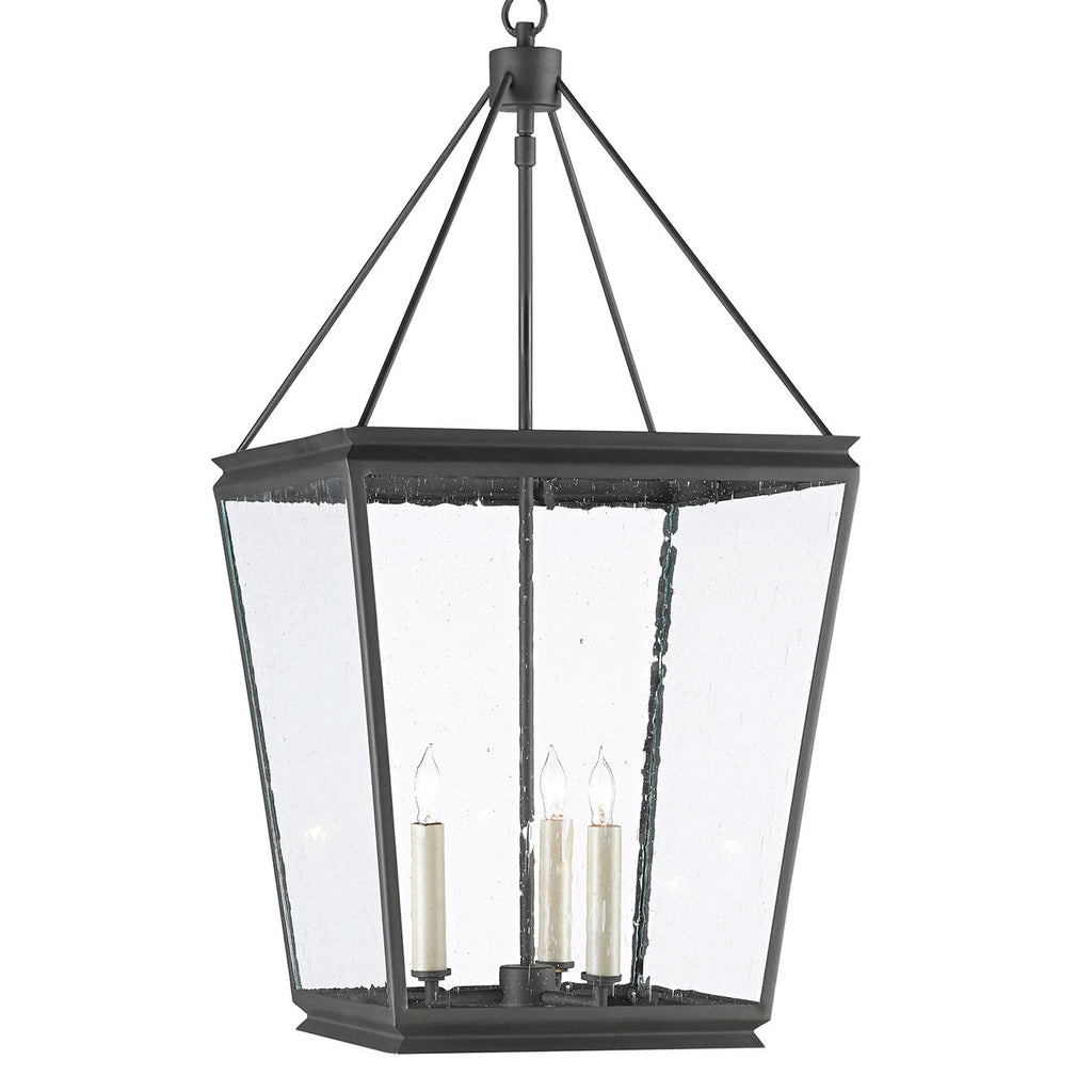 Classic is as classic does says the Currey & Company Ellerman Lantern, a tried-and-true design that reflects the age-old lantern shape, which never goes out of style. Made of wrought iron in an old iron finish, the black lantern is fitted with seeded glass panels to complete the feel that this is a fixture rooted in Americana, the illumination from the three lights diffused by the textured glass.