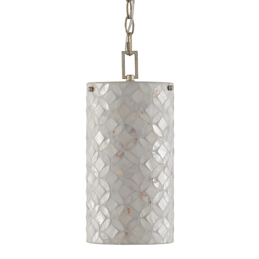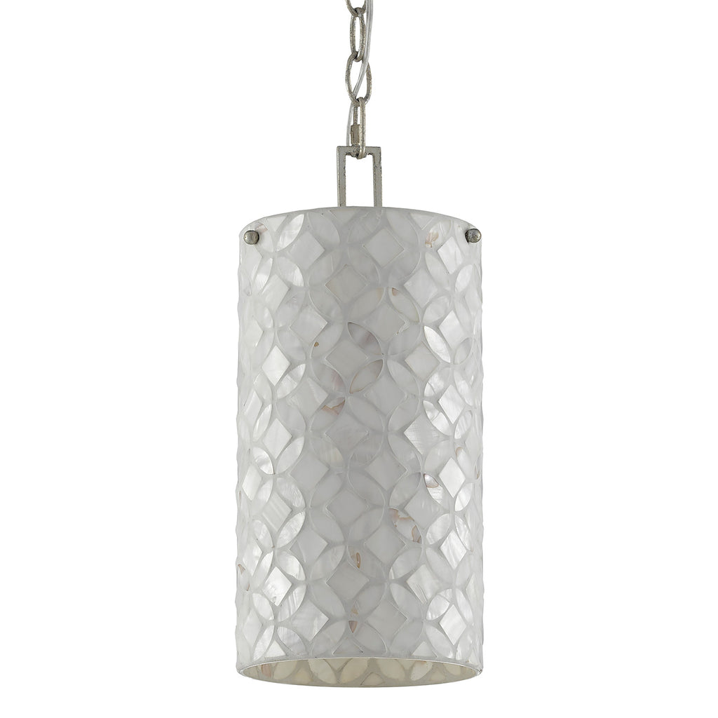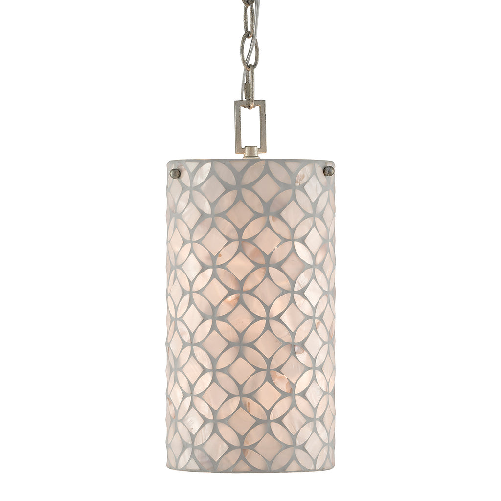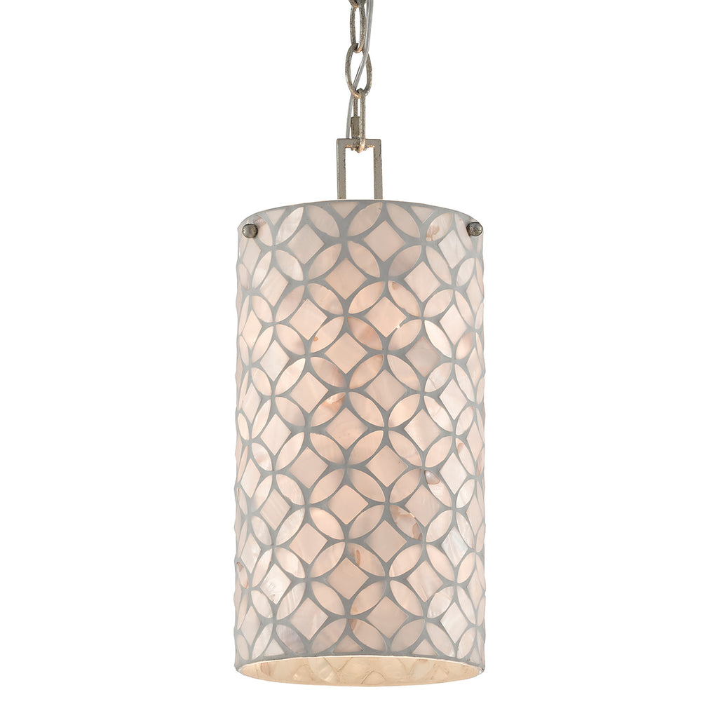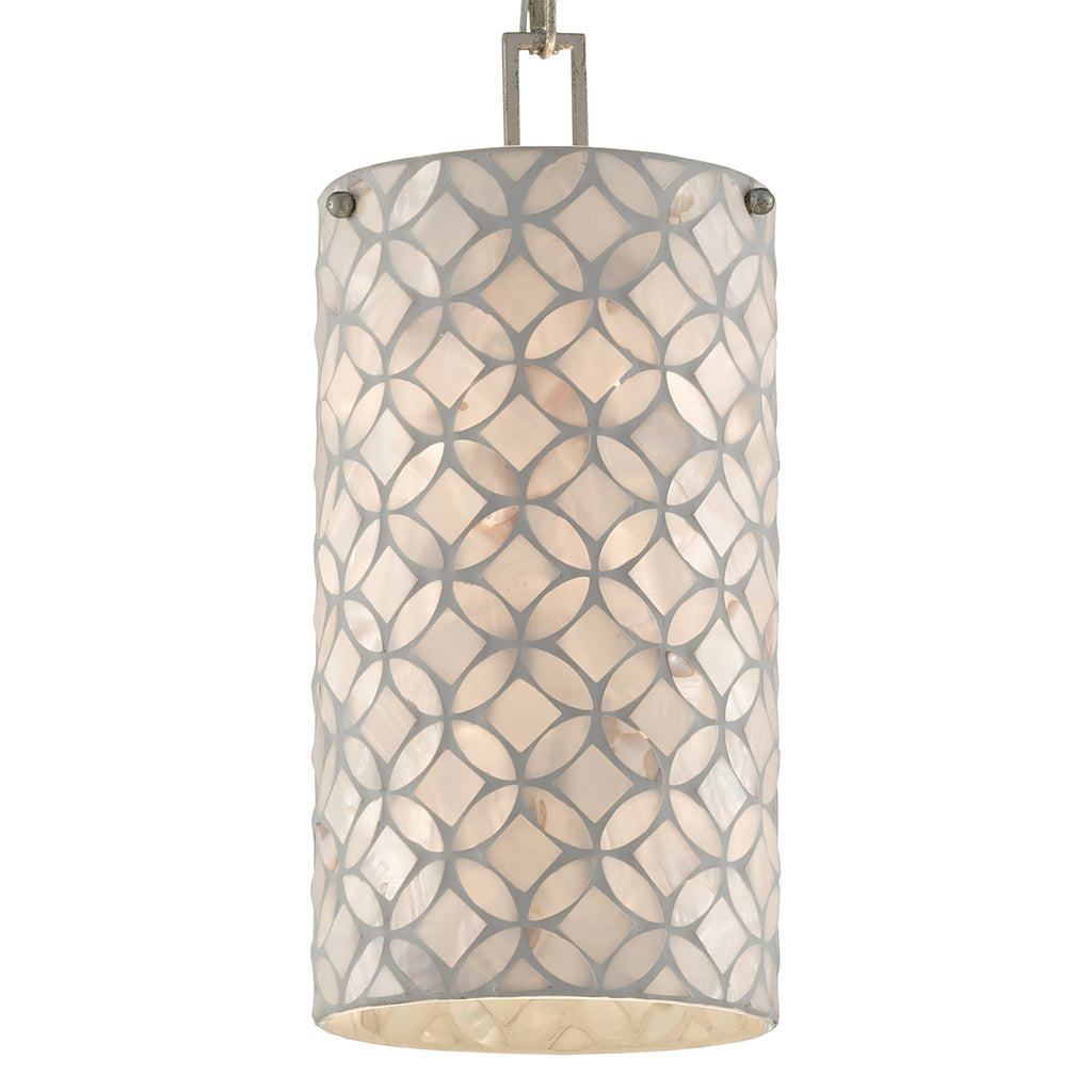 The four-point star and circle pattern of the shade on the Currey & Co Ellison Pendant takes on added luminosity given it is made with mother of pearl. The antique silver leaf finish on the chain and the rectangular chainloop bring cohesion to this design that would be ideal for any room with a feminine feel, though we could also see it glowing beautifully in a boho chic interior that has a refined stylistic bent or hanging from a high ceiling above a substantial kitchen island in rows.