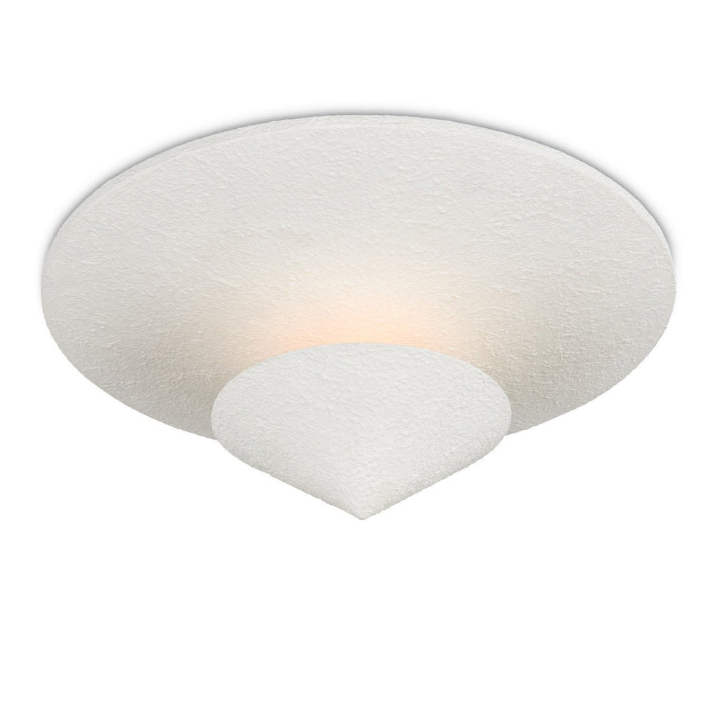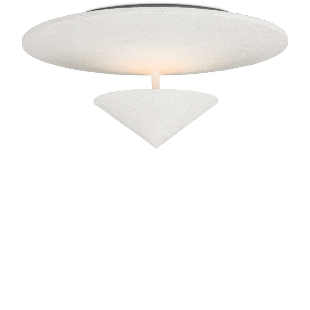 Playing with a geometrical shape that creates up-light, the Empyrean Flush Mount was designed with clean lines, making it as contemporary as designs come. The cone shape of the bottom feature is a design detail that brings added interest to the profile of this white flush mount. The wrought iron fixture is covered in a yeso blanco finish to add a subtle texture to the decidedly modern flush mount.