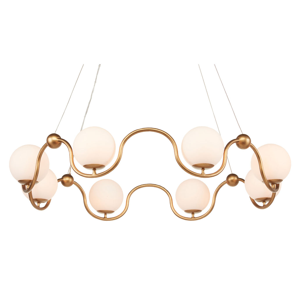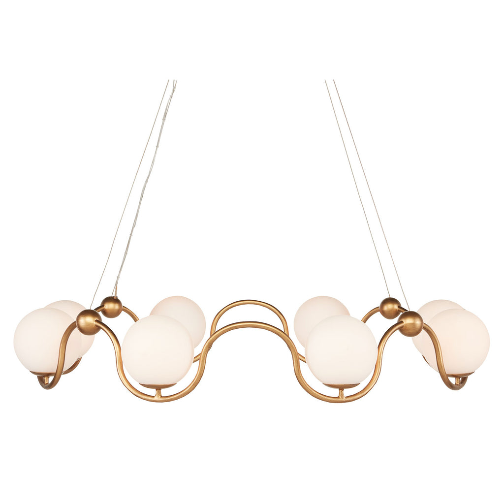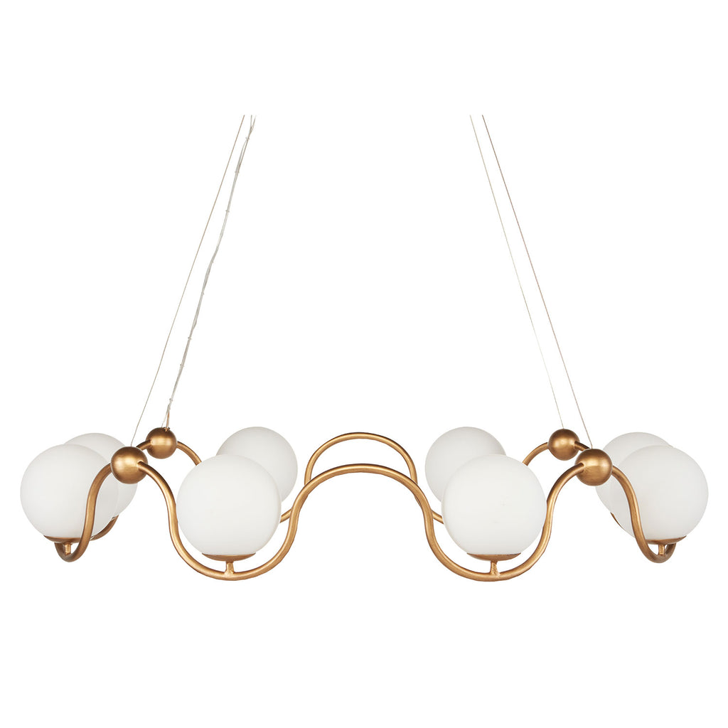 The Currey & Co Equilibrium Chandelier is a gold chandelier with lovely glowing globes inspired by Milano aesthetics. The way the undulant frame swirls around the opaque white glass globes allows the composition to maintain its balance perfectly. The antique brass finish on the wrought iron frame is a warm contrast. A design that is still di rigore in the great opera houses in Italy's most fashionable city of Milan, it brings with it a seriously refined aesthetic.