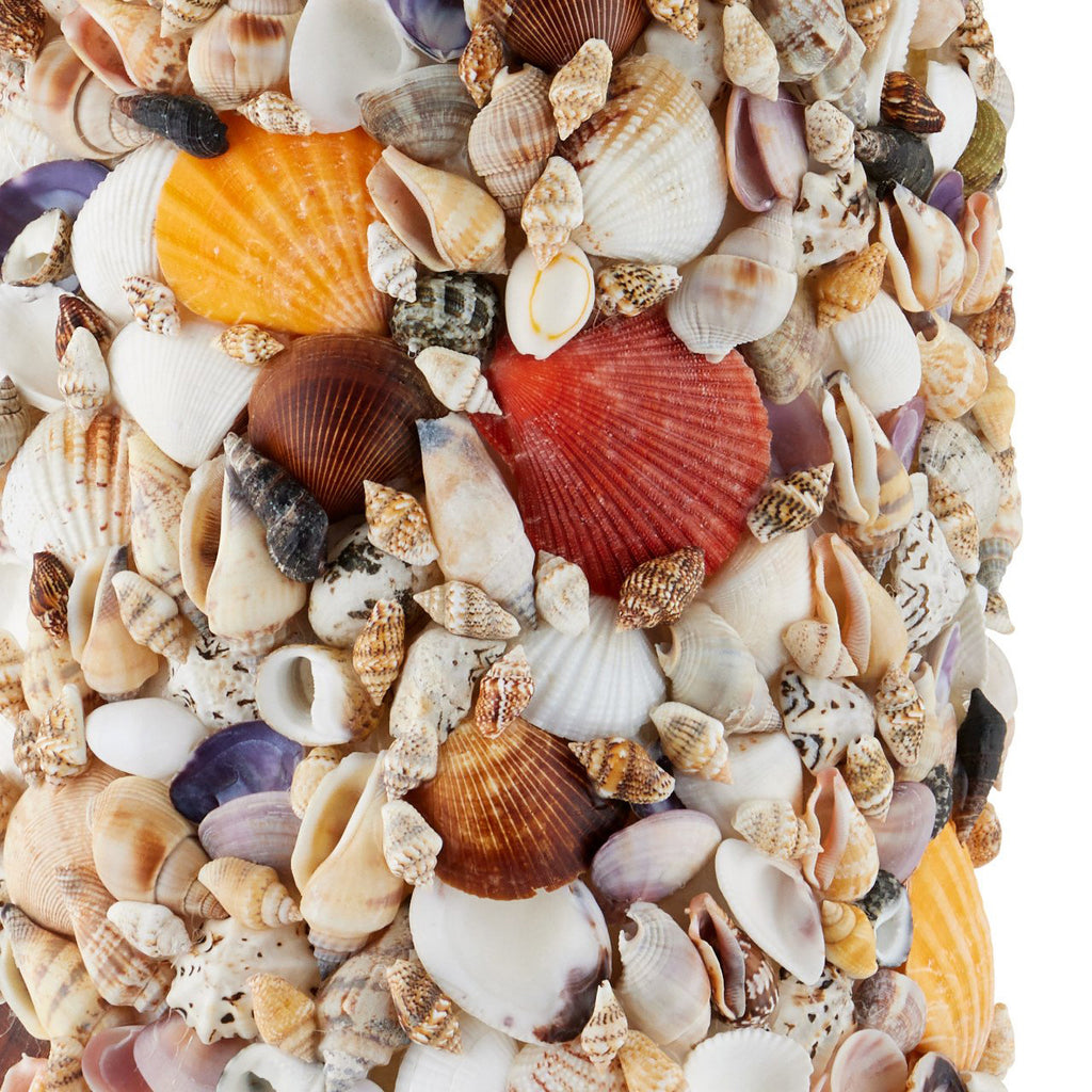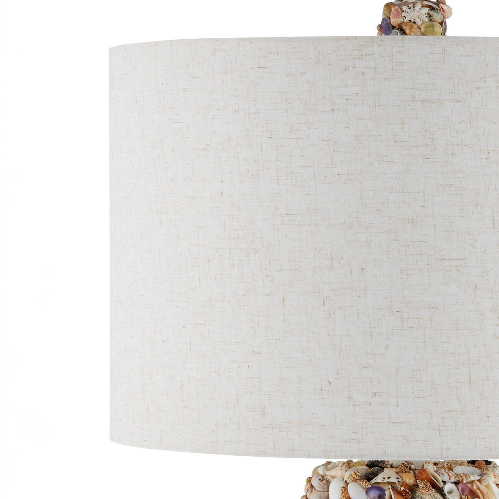 As its name implies, the tall columnar body of the Festoon Table Lamp is adorned with assorted seashells in an array of colors and shapes that have been sprinkled artfully along its surface. The hardware in a sugar white finish matches the palest ark and auger shells, and the ivory drum shade draws out the beige speckles in the tiny scallop shells. A fun detail on this lamp is the shell-encrusted finial.
