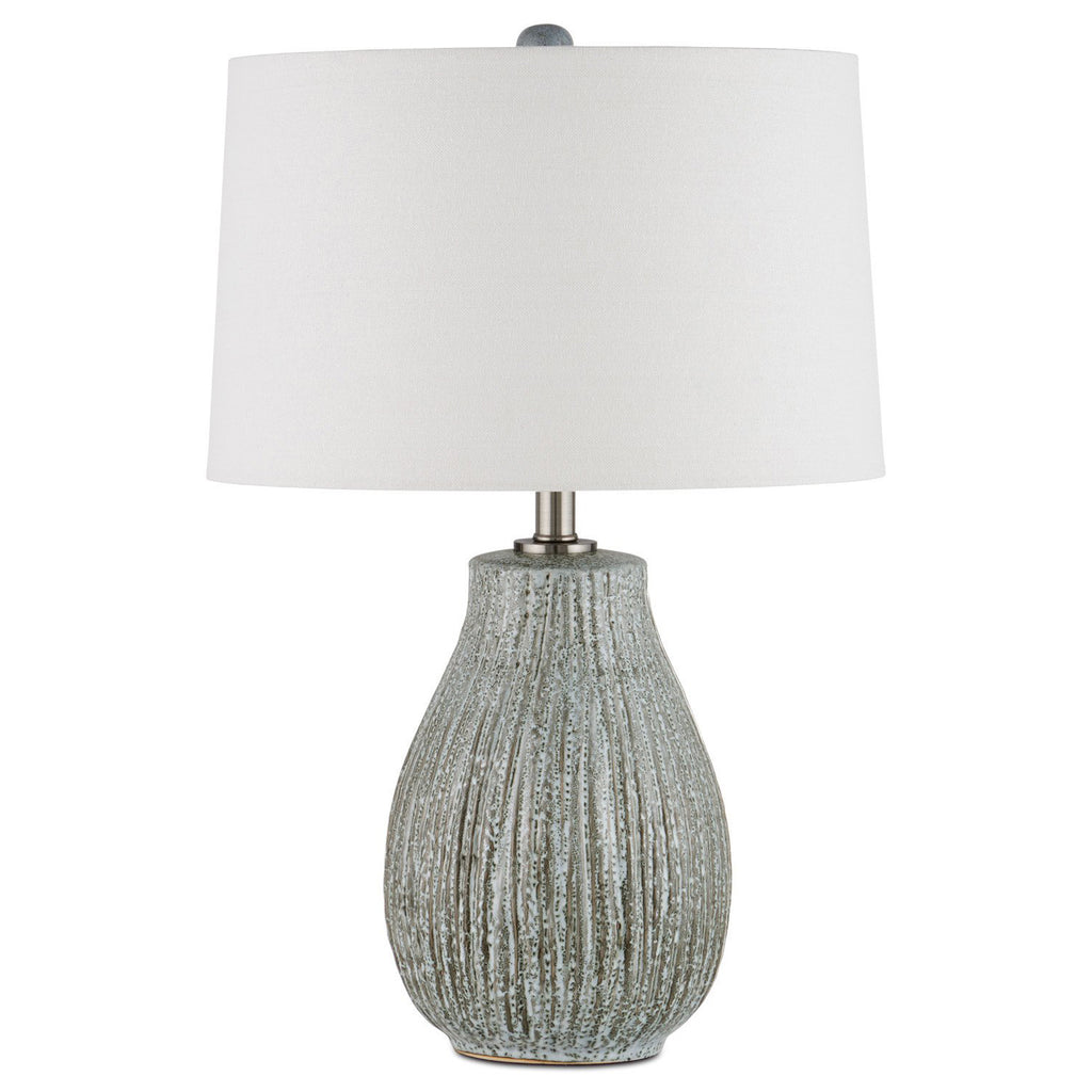 The reactive black and white glaze on the surface of the Fidella Table Lamp is only one of the facets of this design that brings it a jaw-dropping texture. The bubbles that are inherent in artisanal glazing and the striations carved into the body of the ceramic lamp also contribute to the patina. The finial that matches the pear-shaped body's color and fastens the drum shade to the gray lamp completes this interesting composition.
