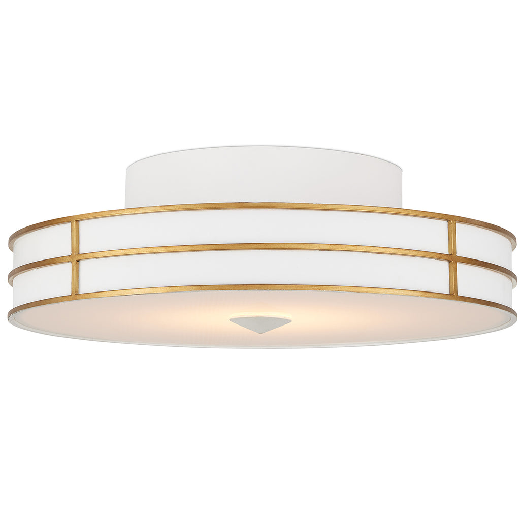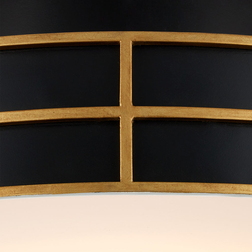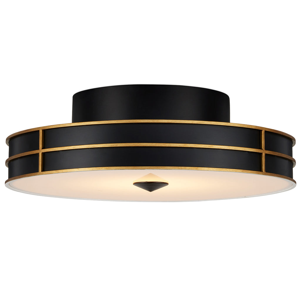 The design of the Currey & Co Fielding Flush Mount was inspired by the engineering capabilities that its integrated LED technologies bring to the table. Tom Caldwell was looking to create a very modern profile -- one that has a hint of Hollywood glamour in its makeup. Made of wrought iron, the exterior of the shade is in a sophisticated mix of Satin Black and Contemporary Gold finishes with a Sugar White rim where the metal meets the acrylic diffuser.