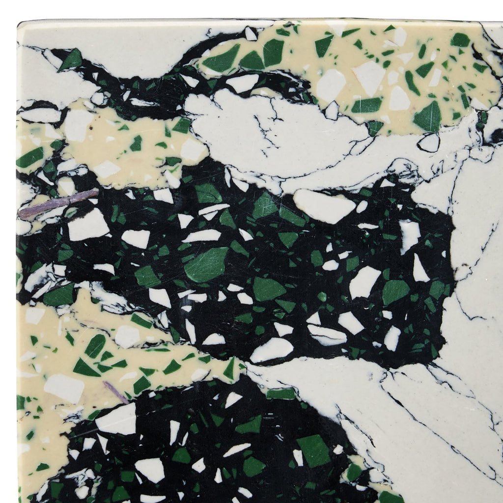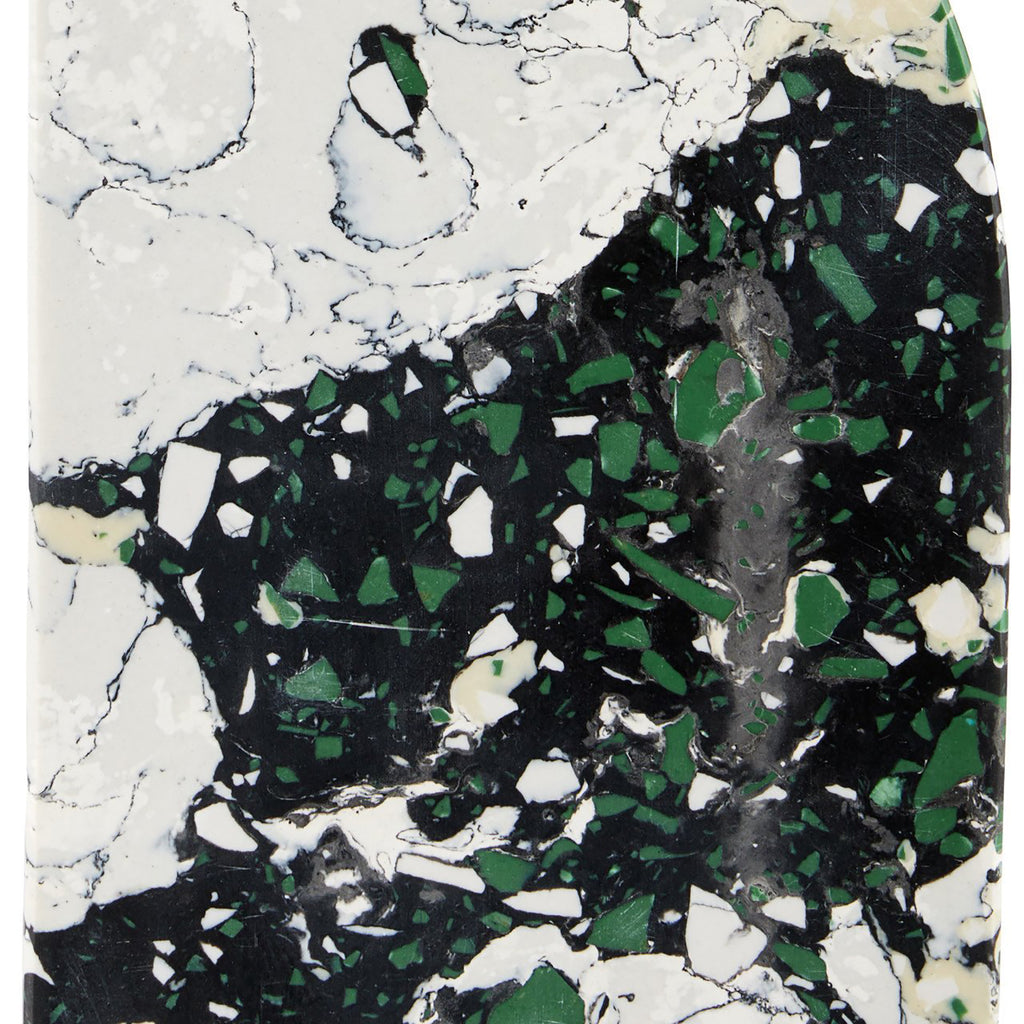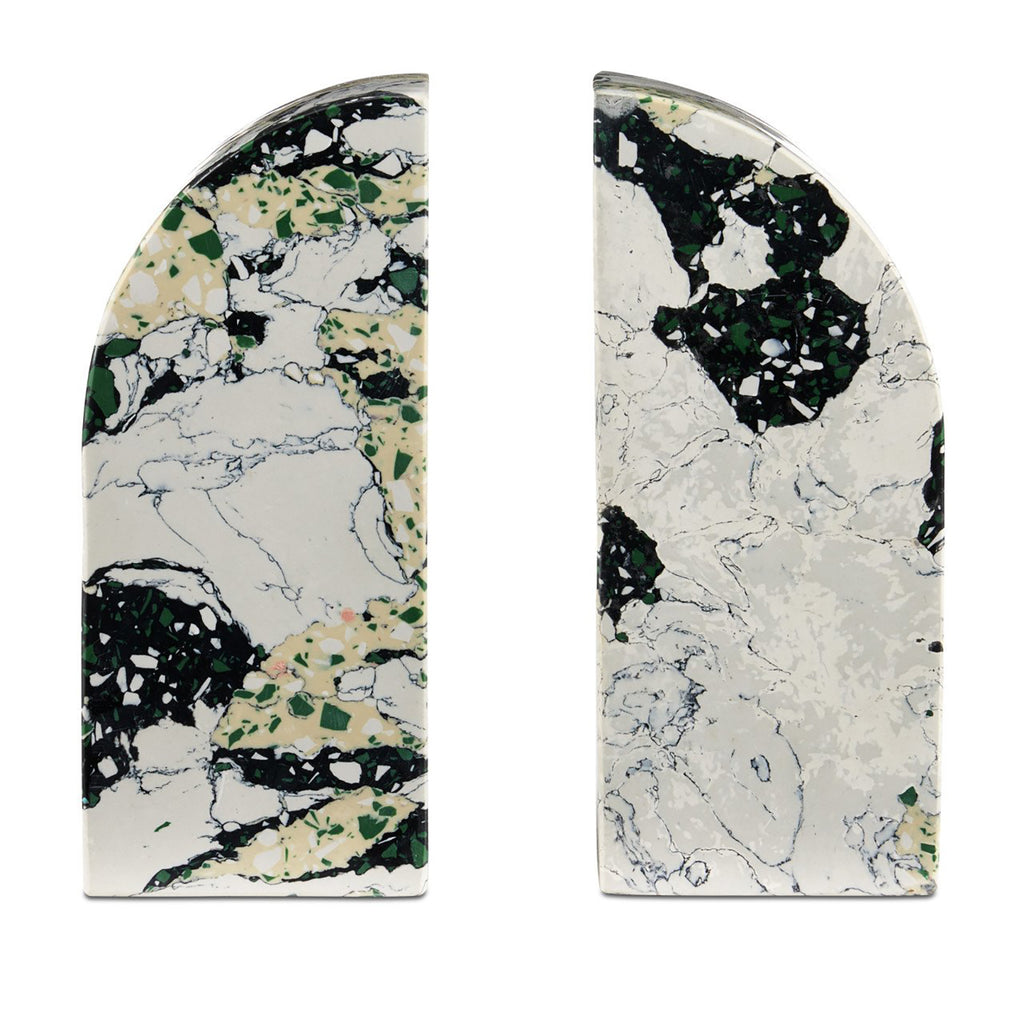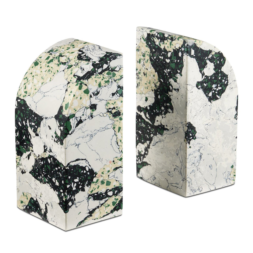 The Currey & Co Fossey Object Set is a pair of sculptures that look like they are made of natural granite, but are actually made of synthetic stone. The black and white decorative accessories with hints of green and pale yellow have swirling personalities that make them textural accents. The one curved edge brings them interesting profiles.
