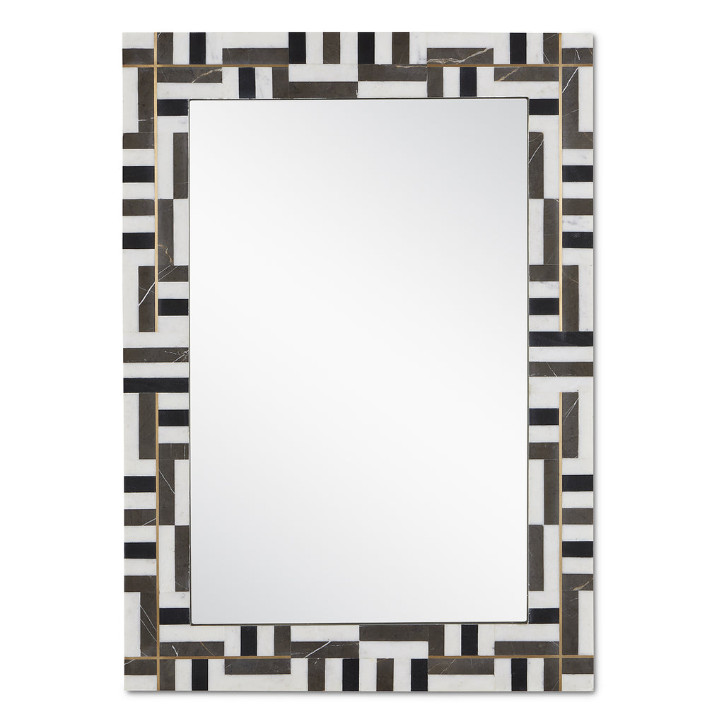 For spaces that will welcome bold geometric patterns, the Gentry Rectangular Mirror will be right at home. The shapes that make up the pattern are fashioned from three different types of marble: Ambaji, Marquina, and Pietra Gray. Bringing a hint of brightness to the composition is the brass inlay that intersects on some edges where the marble pieces meet; the fact that they do so in a random composition adds interest to the black and white mirror. The inside edge of the frame where it intersects with the glass is black. There are two cleats on the mirror so it can be hung vertically or horizontally.