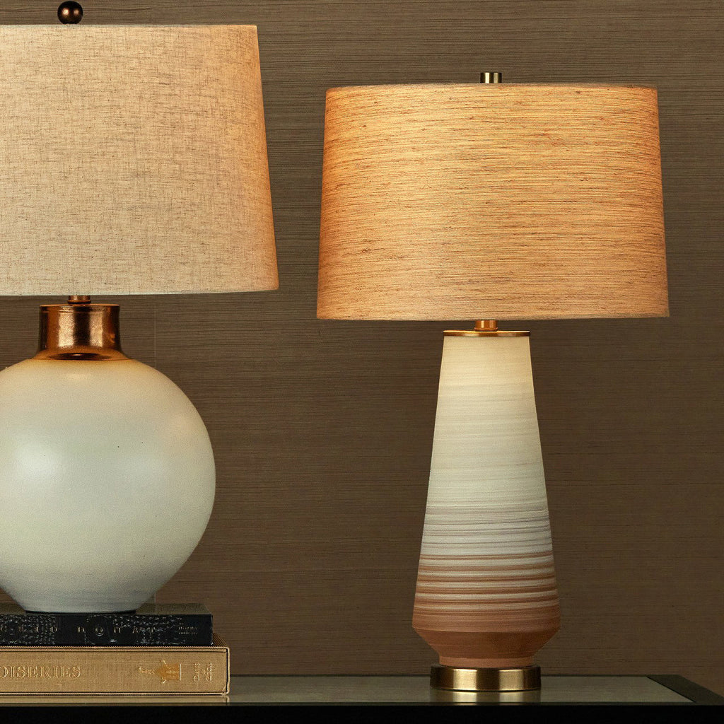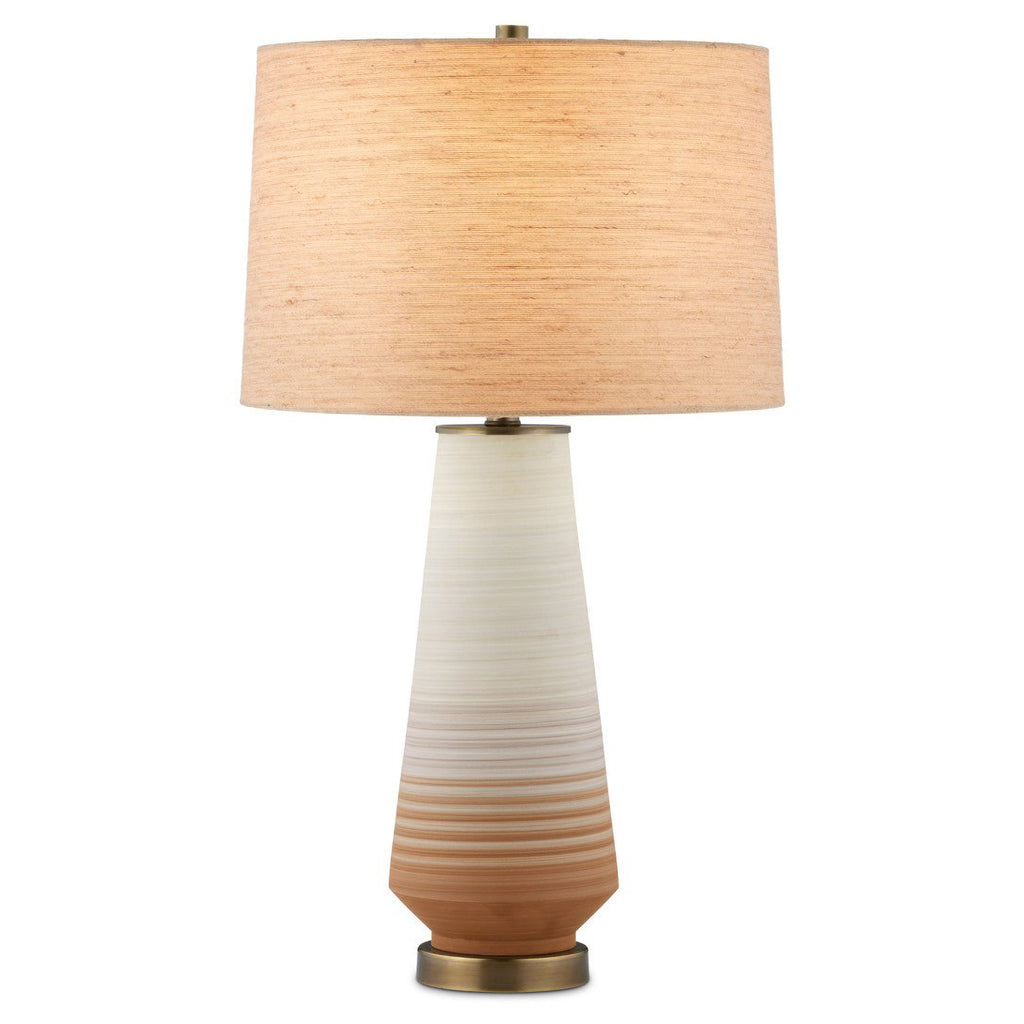 The patterning on the surface of the Geologie Table Lamp takes great skill to create because it is glazed while it is on the wheel, which requires steady hand-eye coordination. Made of porcelain in a mix of beige, pale gray, and brown, the body of the lamp sits atop a metal base in an antique brass finish. A finial in the same finish fastens the textural shade to the lamp, which echoes the darker tones where the body meets the base.