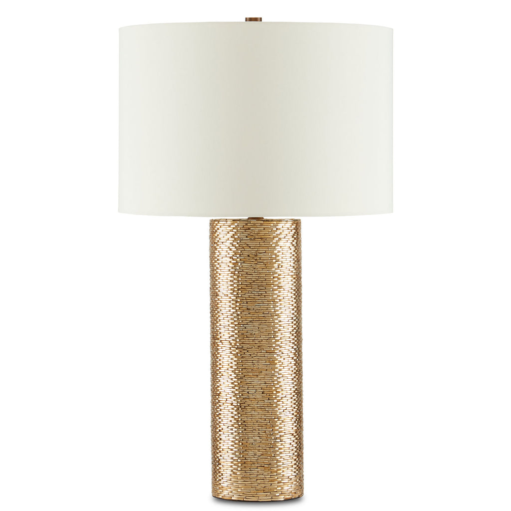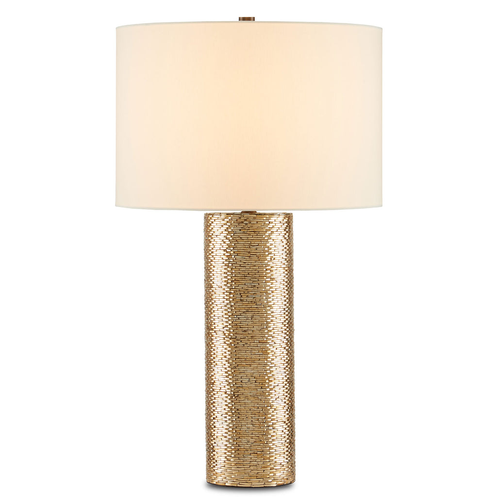 The Currey & Co Glimmer Table Lamp has a textural exterior created by a mosaic of broken-glass bangle bracelets from India that were in pieces when they were hand-applied. The uniformity of the surface of the column requires a painstaking process that takes hours to achieve. The mosaic, which is applied to a wood structure, shimmers given it is made of glass.