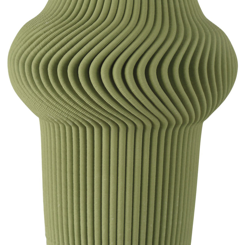 The Green Plisse Vase is attractive in a lovely hue of olive green. The deep furrows that that swirl around the bulge in its form tighten and straighten as they flow to the top and to the bottom in a uniformity that can only be machine-made. The most surprising thing about this handsome vessel is that it is made of 3D-printed porcelain, an ancient material you might not expect to be so amenable to such a contemporary process.