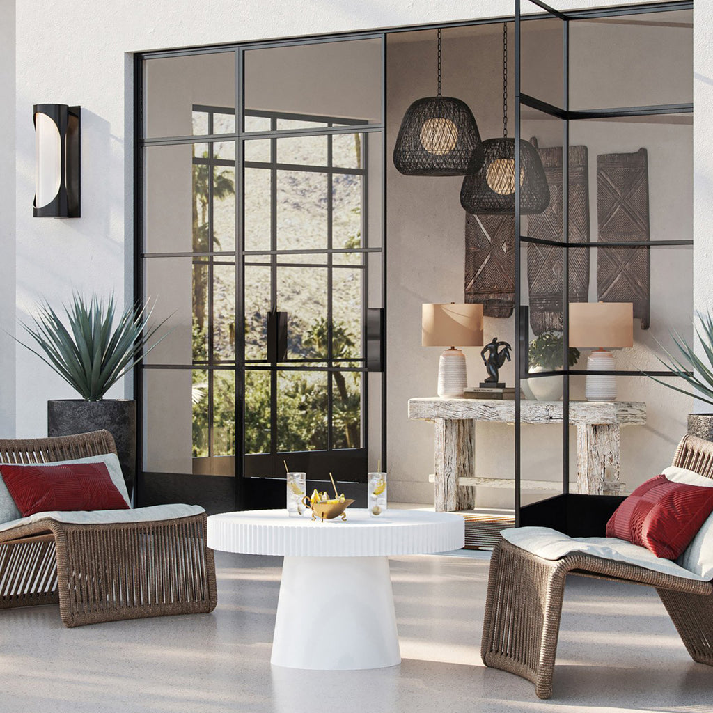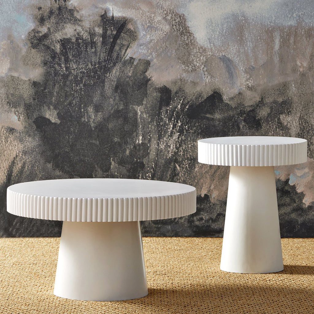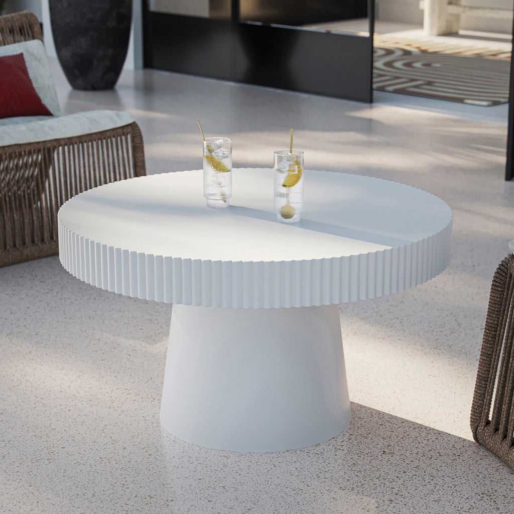 The Currey & Co Harlow White Concrete Cocktail Table, which is handcrafted from concrete that is covered in a white acrylic finish, will withstand weather so it's ideal for outdoor rooms set within terraces and loggias. The crispness of the finish also makes this a modern patio table perfect for homes with contemporary leanings. The white garden table has a fluted edge around its top to bring the piece an uptick in personality.