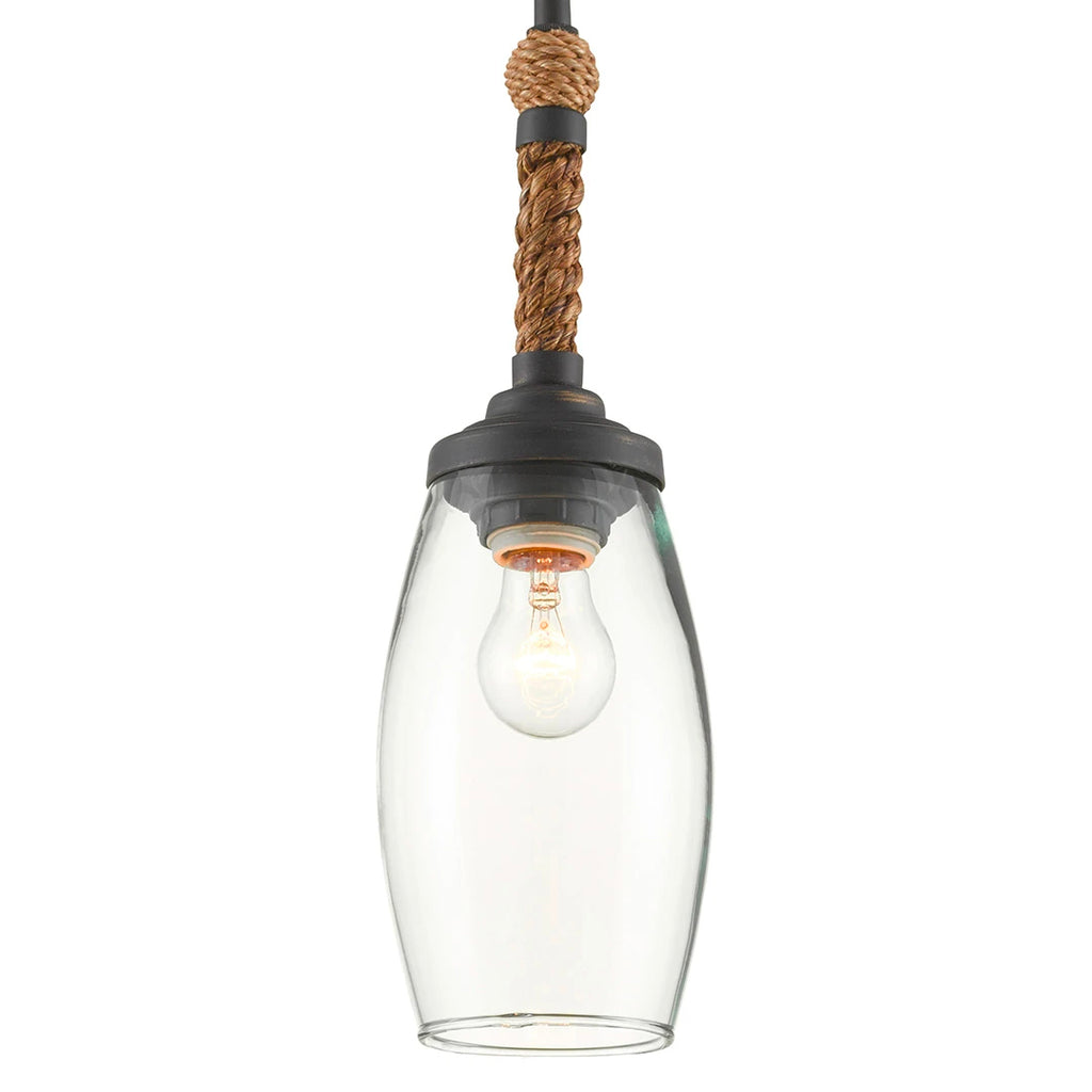 The perfect combination of natural and industrial materials, the Currey & Company Hightider Pendant has a recycled glass shade and wrought iron hardware in a French black finish. The Abacá rope that is wrapped around the neck of the nautical pendant brings it a hint of texture. Clarence Mallari's original inspiration came from the small bells used by people selling ice cream in the Philippines.