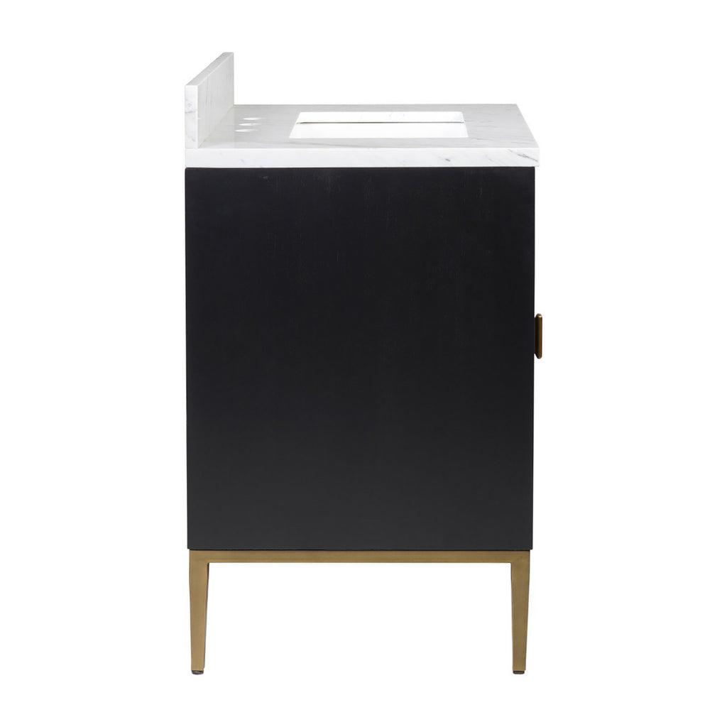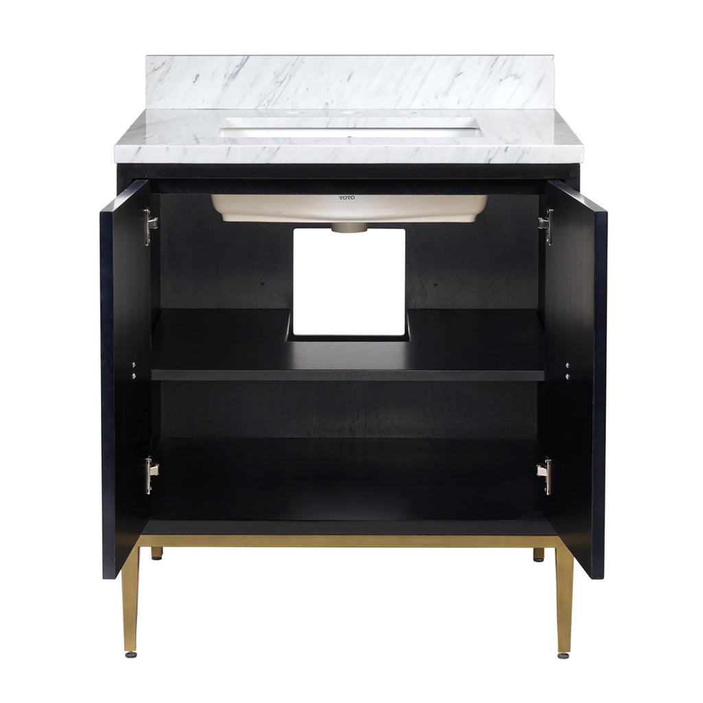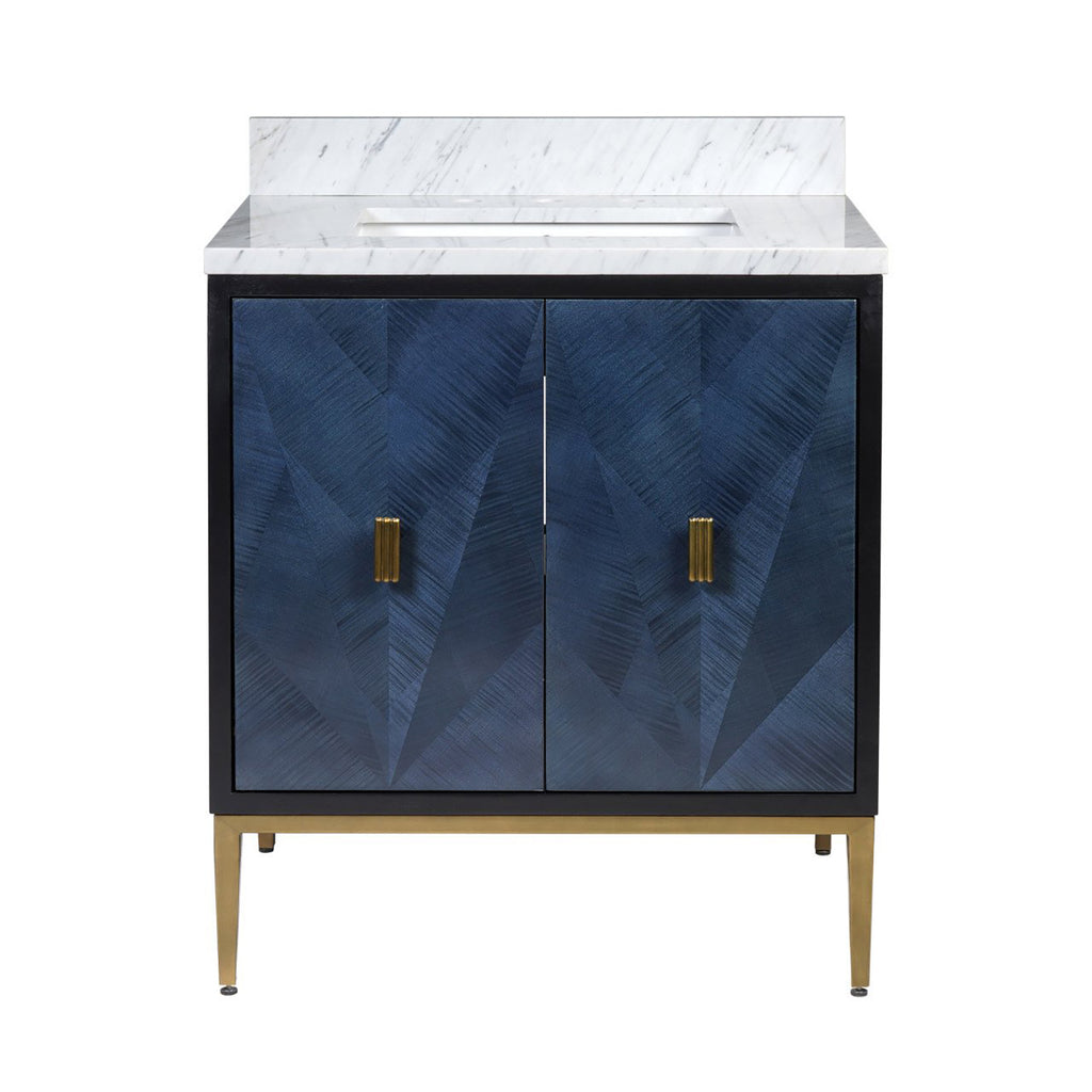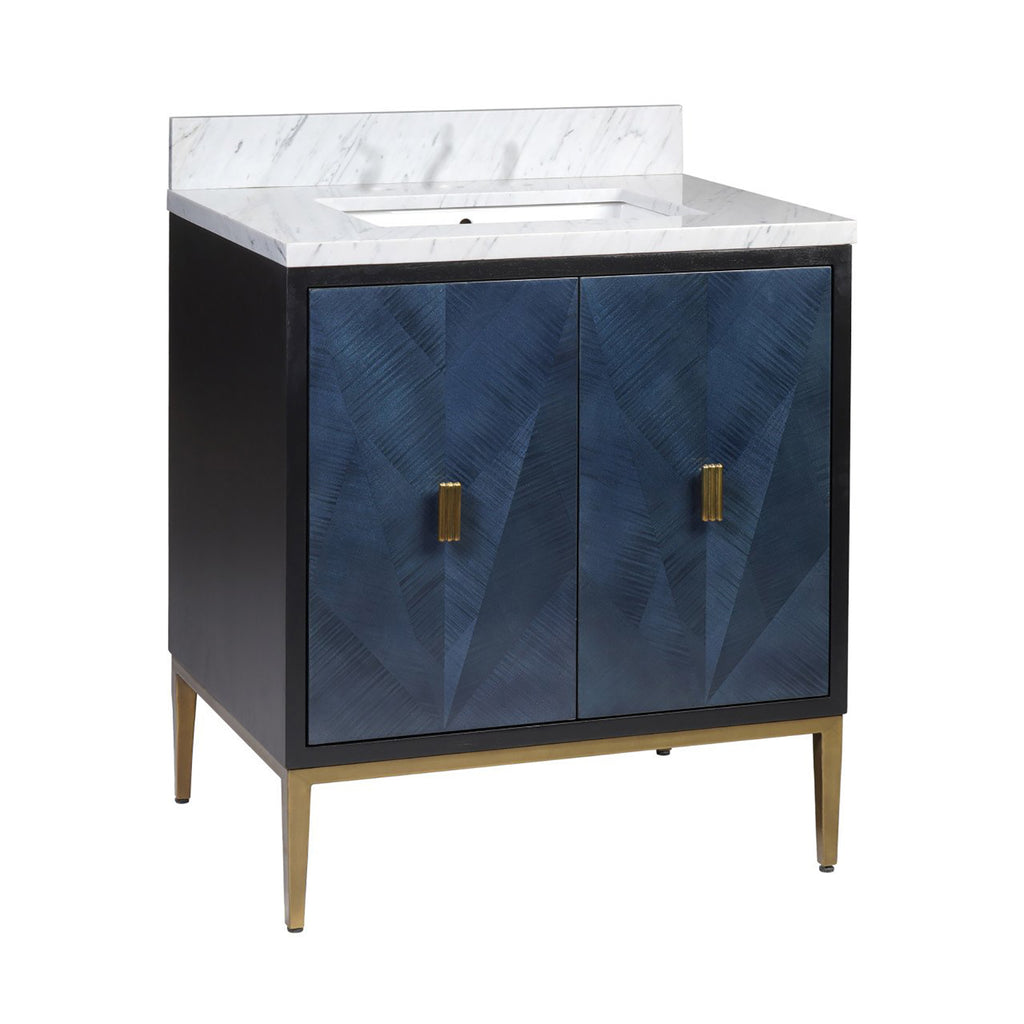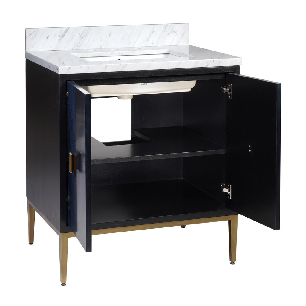 The Currey & Co Kallista 30" Vanity has a dark sapphire blue finish that enlivens the sycamore veneers on its door fronts. The exterior is finished in a glossy caviar black. The vanity sits atop antique brass iron legs and the matching hardware is made of cast brass. The interior has one adjustable shelf and there are two optional wood trays that attach to the inside of the doors. The white Carrara marble top is fitted with a white rectangular undermount sink. Other fine design attributes include soft-close door hinges and a matching marble backsplash.
