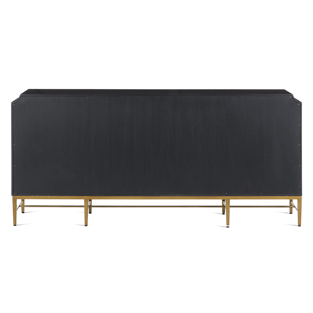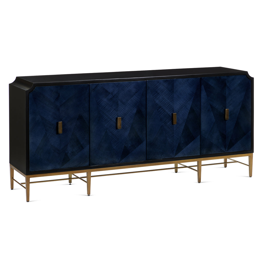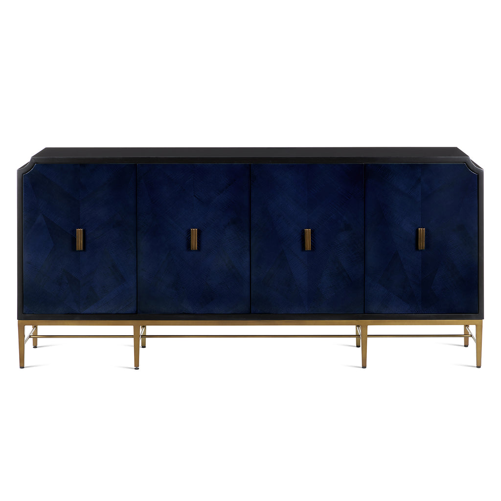 The Kallista Blue Credenza has a dark sapphire blue finish that enlivens the sycamore veneers cladding its doors. These are set into a caviar black credenza sitting atop a metal base in an antique brass finish, which matches the tone of tailored door pulls. The way the wood veneers are applied brings depth, texture, and movement to this navy-blue credenza that is dressy enough for the most sophisticated home office and the most refined business settings. Aimee Kurzner designed the beautiful Kallista family of products.