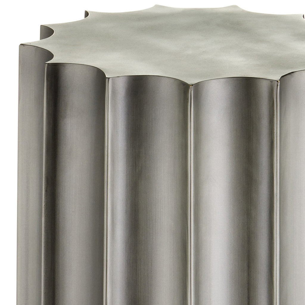 Made of iron in a graphite finish with a subtle ombré effect, the surface of the Kanti Pedestal darkens as it moves toward the bottom. The gray pedestal, that will support a sculpture or an oversized vase, has an ample dose of personality for an accessory because its fluted shape brings both the sides and the top added interest. The bottom of the pedestal is covered in felt to keep it from damaging any underlying surfaces.