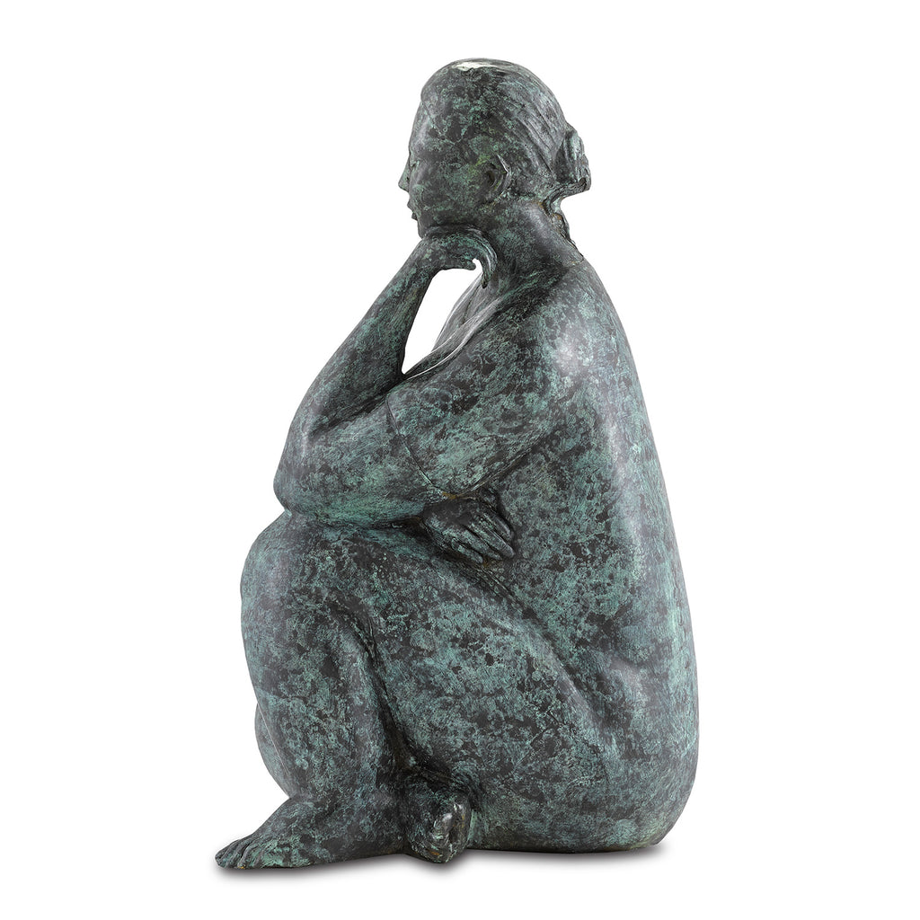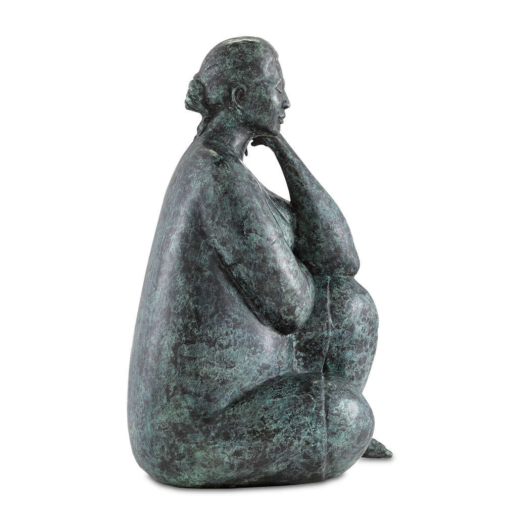 The Currey & Company Lady Meditating Bronze sculpture is made from a lost-wax technique when boiling bronze is poured into a mold covering an original wax sculpture that melts away. Once set, there is a very long process of refining the bronze to give it patina. This is among the Currey & Company bronze art pieces originally created by an unknown artist.
